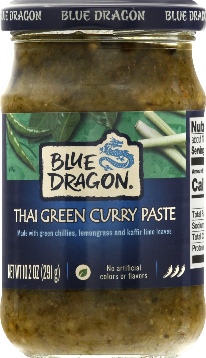 Made with green chillies, lemongrass and kaffir lime leaves. No artificial colors or flavors. bluedragon.com. Facebook. Instagram. Produced in Poland.