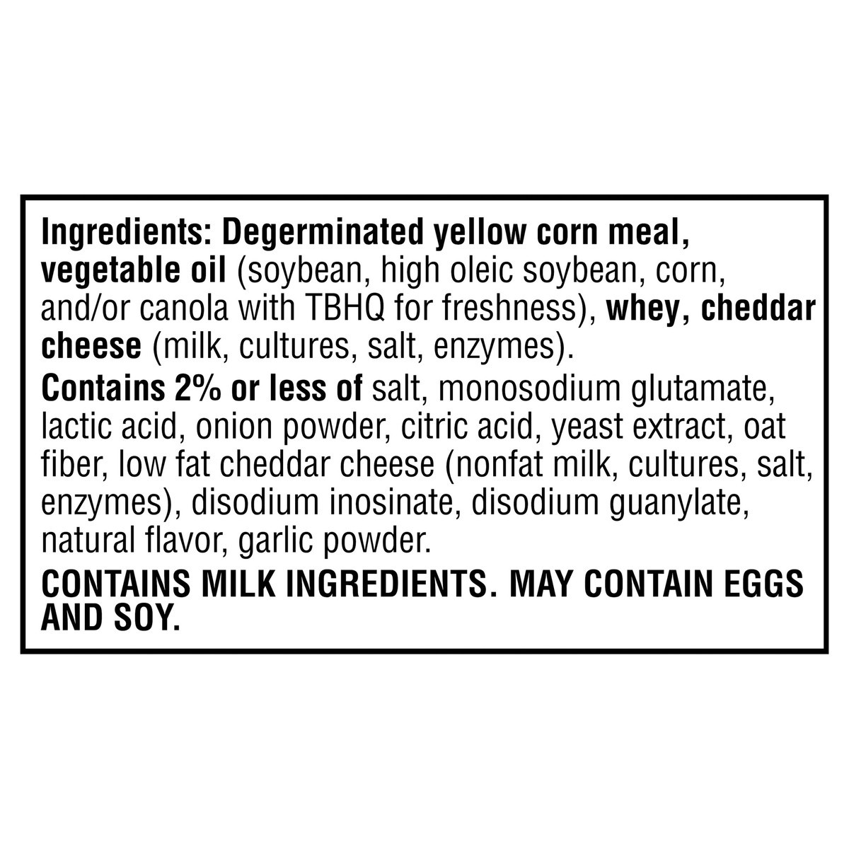 Degerminated Yellow Corn Meal, Vegetable Oil (Soybean, High Oleic Soybean, Corn, and/or Canola with TBHQ for Freshness), Whey, Cheddar Cheese (Milk, Cultures, Salt, Enzymes). Contains 2% or Less of Sa…