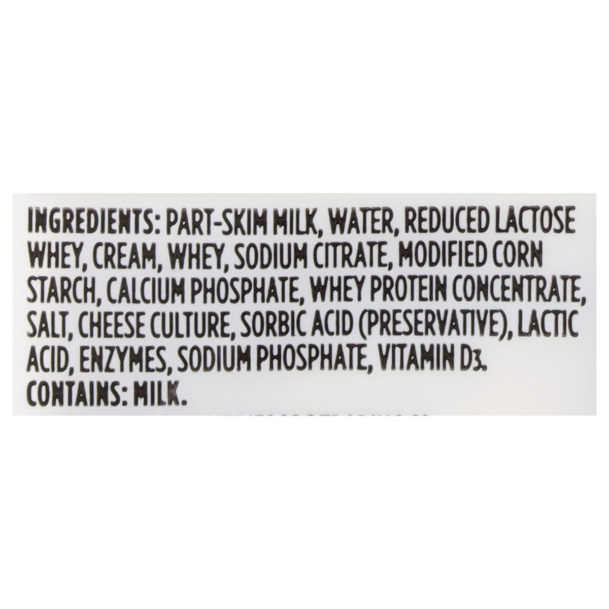 Part-Skim Milk, Water, Reduced Lactose Whey, Cream, Whey, Sodium Citrate, Modified Corn Starch, Calcium Phosphate, Whey Protein Concentrate, Salt, Cheese Culture, Sorbic Acid (Preservative), Lactic Ac…