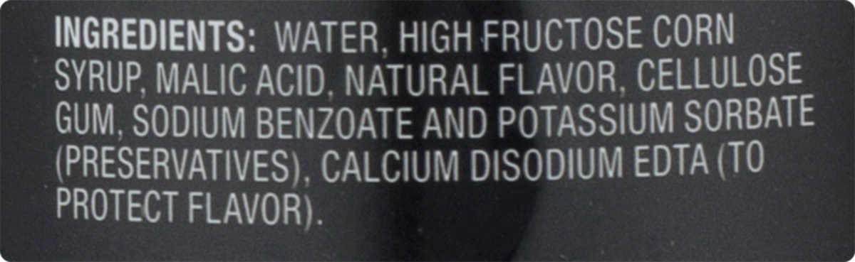 Water, High Fructose Corn Syrup, Malic Acid, Natural Flavors, Cellulose Gum, Sodium Benzoate and Potassium Sorbate (to Protect Flavor), Calcium Disodium EDTA (to Protect Flavor).