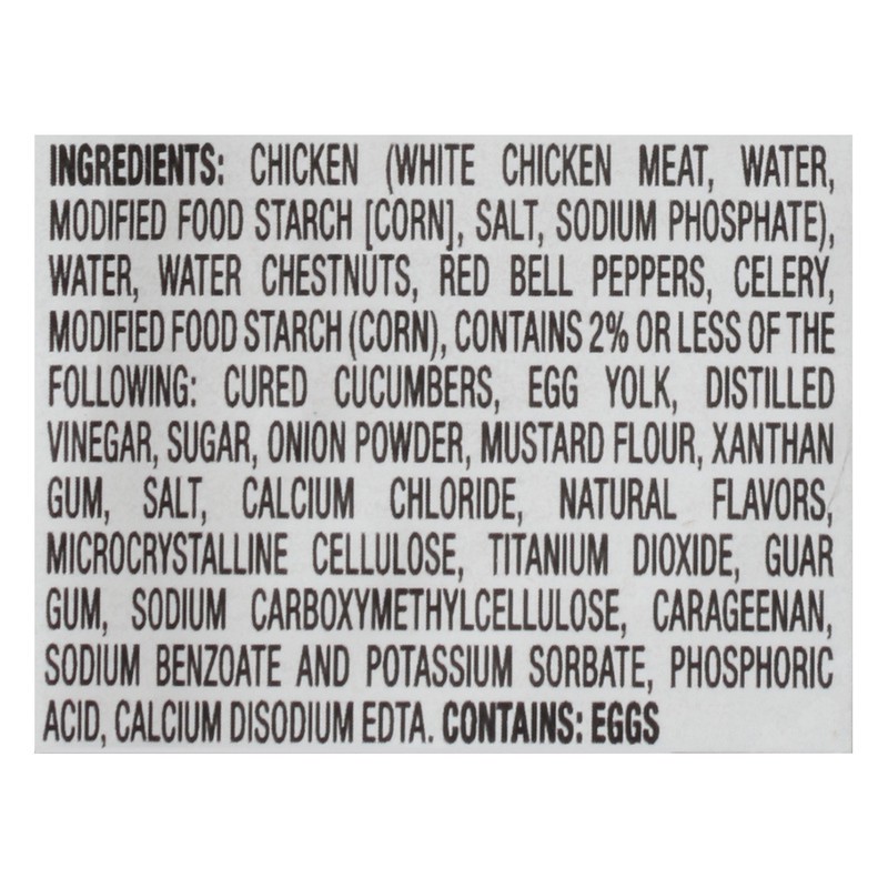 Chicken (White Chicken Meat, Water, Modified Food Starch [Corn], Salt, Sodium Phosphate), Water, Water Chestnuts, Red Bell Peppers, Celery, Modified Food Starch (Corn), Contains 2% or Less of the Foll…