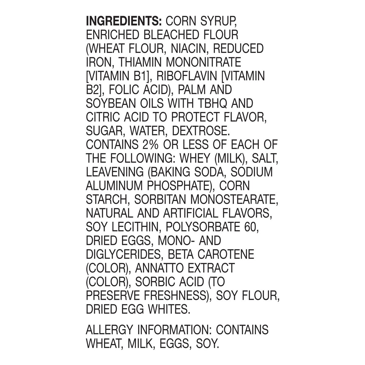 Corn Syrup, Enriched Bleached Flour (Wheat Flour, Niacin, Reduced Iron, Thiamin Mononitrate [Vitamin B1], Riboflavin [Vitamin B2], Folic Acid), Palm and Soybean Oils with TBHQ and Citric Acid to Prote…