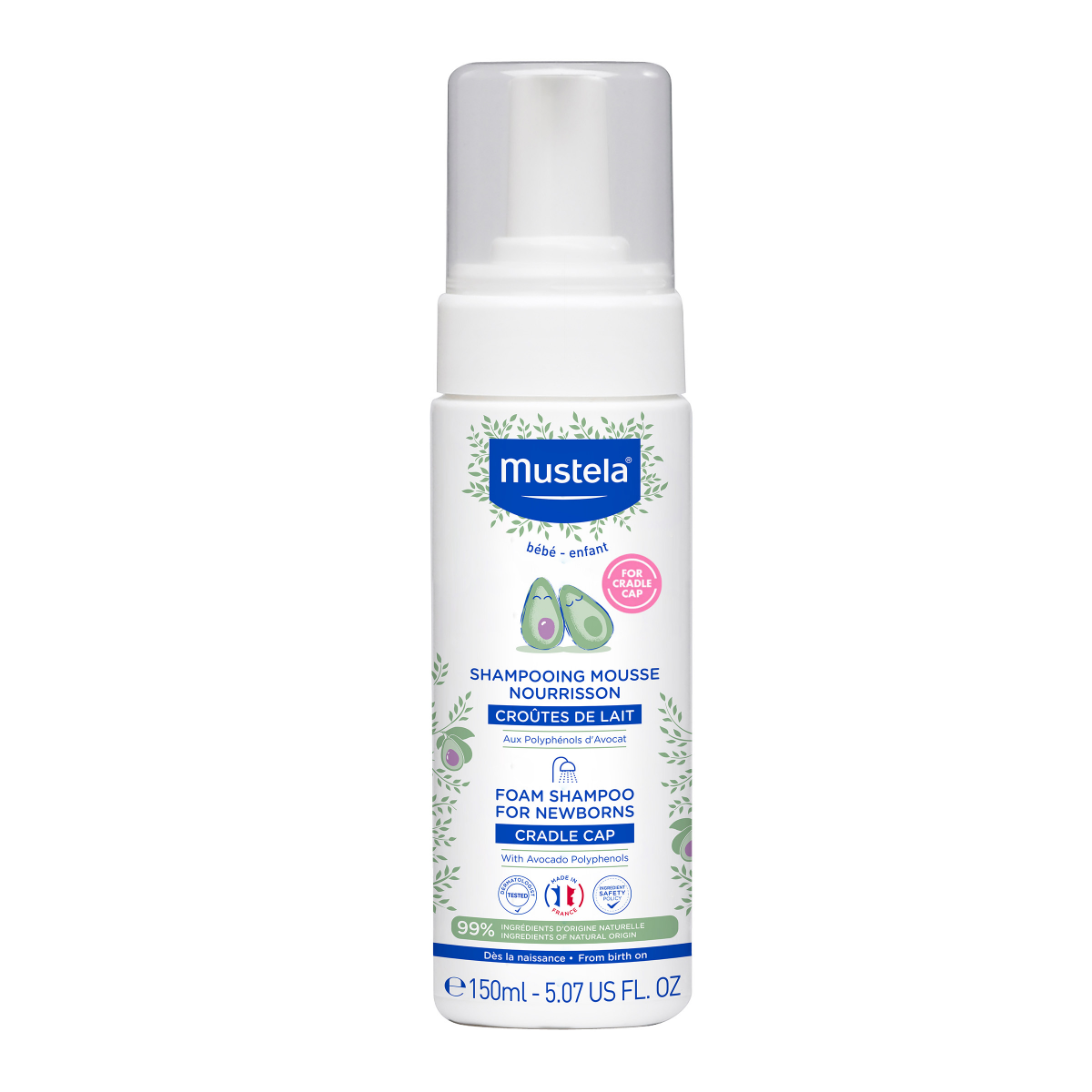 Mustelas Foam Shampoo for Newborns is made with 99 plantbased ingredients that gently cleanse and nourish delicate newborn skin while effectively treating cradle cap.