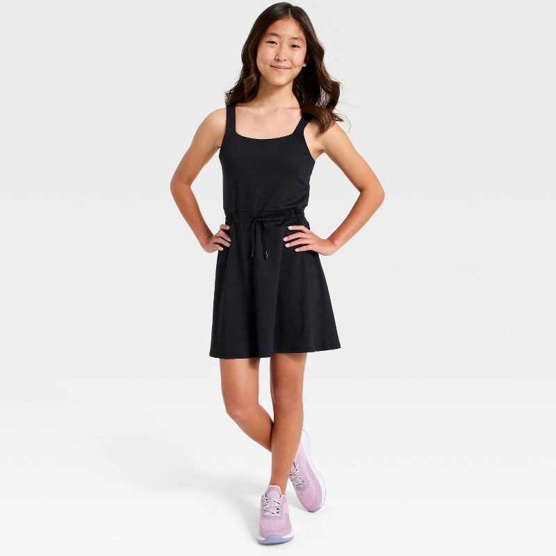 Why we're ALL IN:Knit active dress with a sleeveless design, scoop neckline and comfy shoulder straps. Crafted from midweight recycled polyester-spandex blend jersey fabric to keep your child moving c…