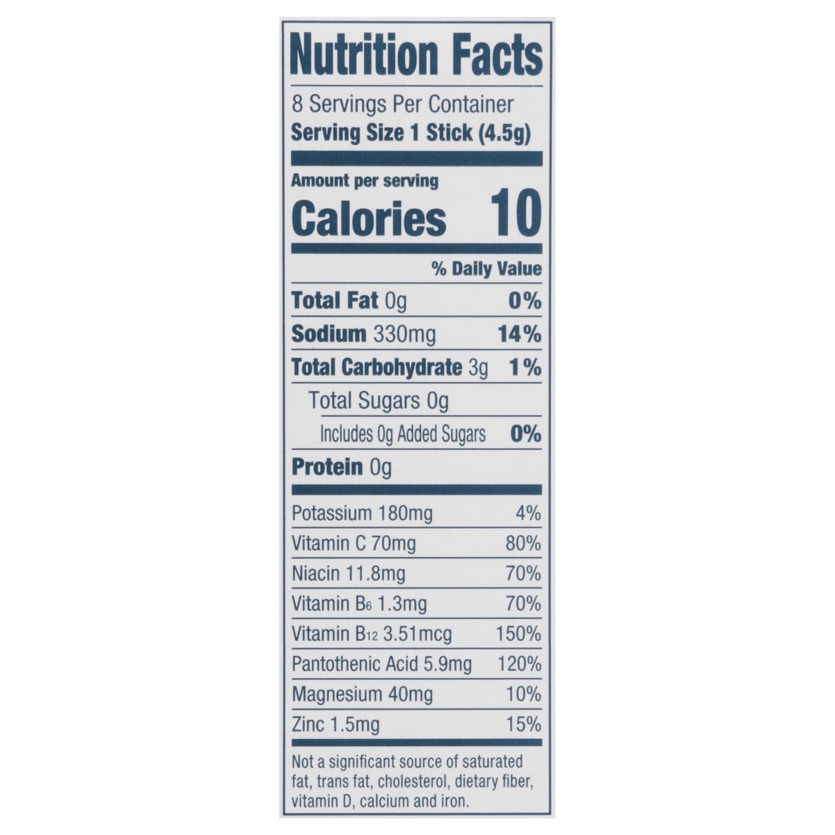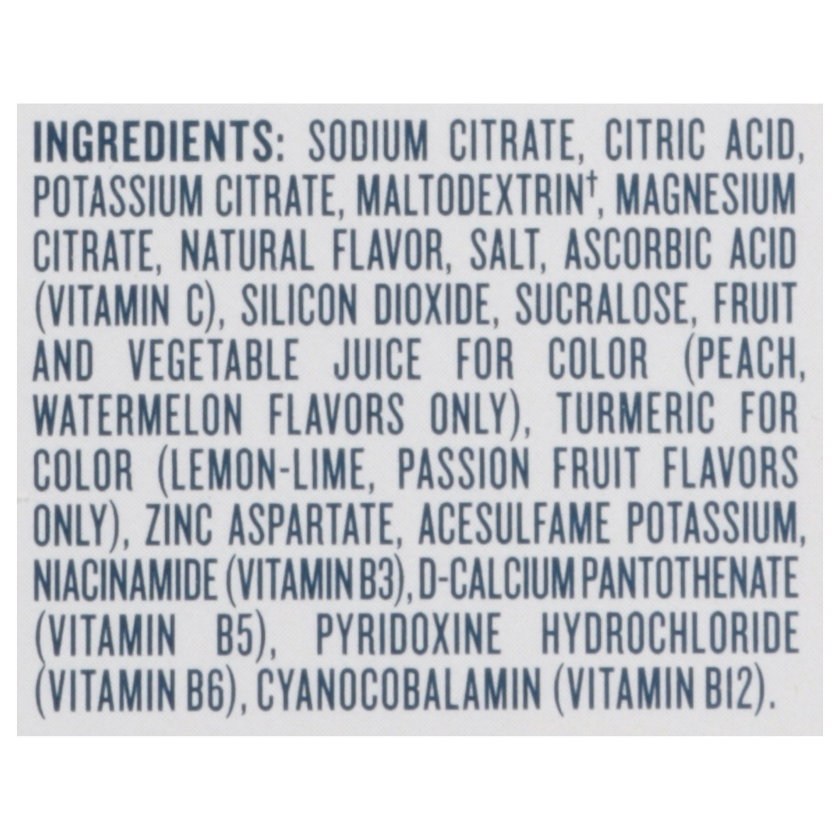 Sodium Citrate, Citric Acid, Potassium Citrate, Maltodextrin(a), Magnesium Citrate, Natural Flavor, Salt, Ascorbic Acid (Vitamin C), Silicon Dioxide, Sucralose, Fruit and Vegetable Juice for Color (Pe…