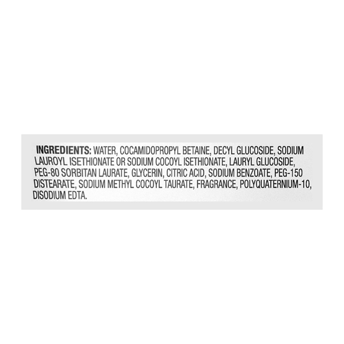 Water, Cocamidopropyl Betaine, Decyl Glucoside, Sodium Lauroyl Isethionate or Sodium Cocoyl Isethionate, Lauryl Glucoside, PEG-80 Sorbitan Laurate, Glycerin, Citric Acid, Sodium Benzoate, PEG-150 Dist…