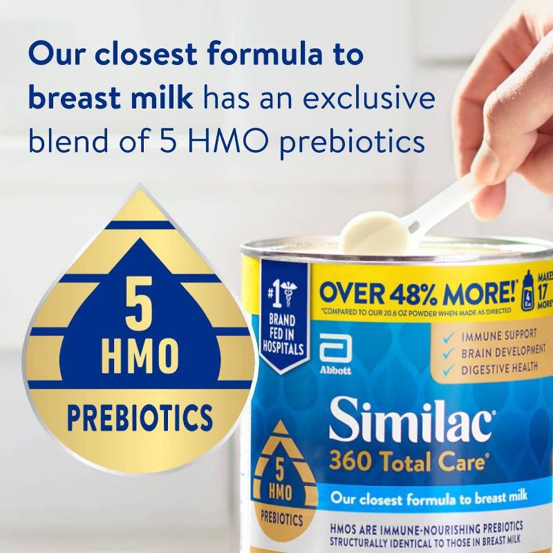 - HAS OUR CLOSEST PREBIOTIC BLEND TO THAT IN BREAST MILK: Similac 360 Total Care, our biggest formula breakthrough, has an exclusive blend of 5 HMO prebiotics structurally identical to those in breast milk