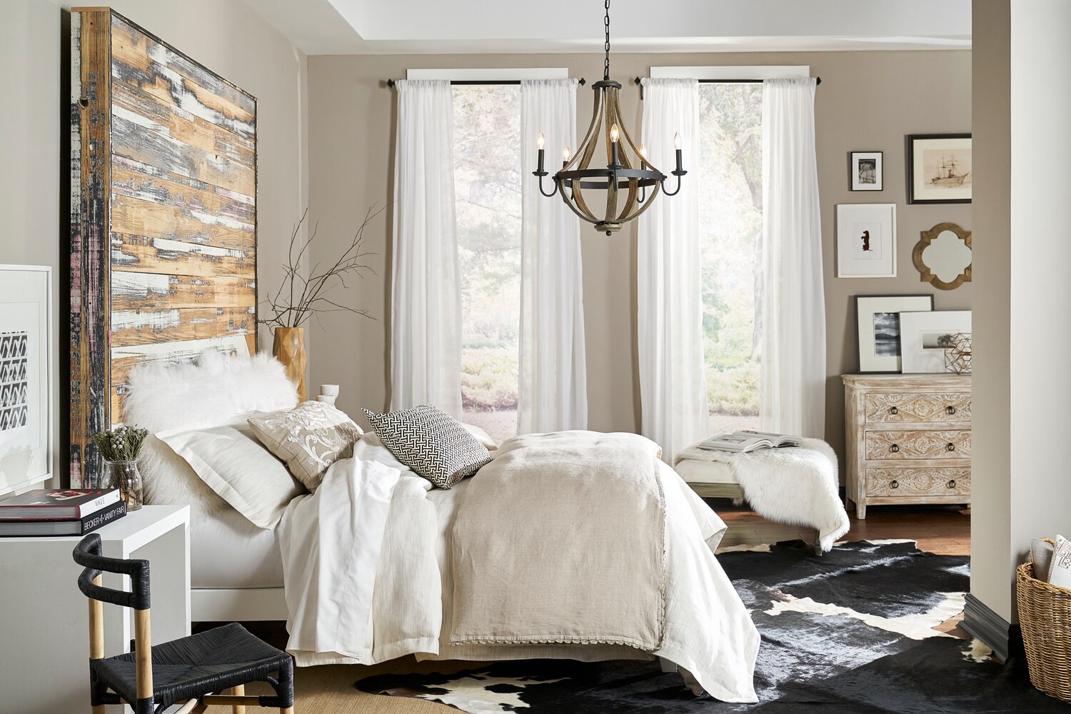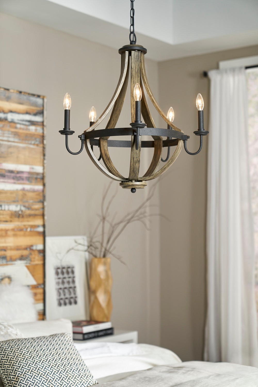 Distressed black and wood finish chandelier from the Merlot collection. Faux candlesticks give a vintage look to this elegant fixture. Requires five 60-watt candelabra based bulbs (sold separately). F…