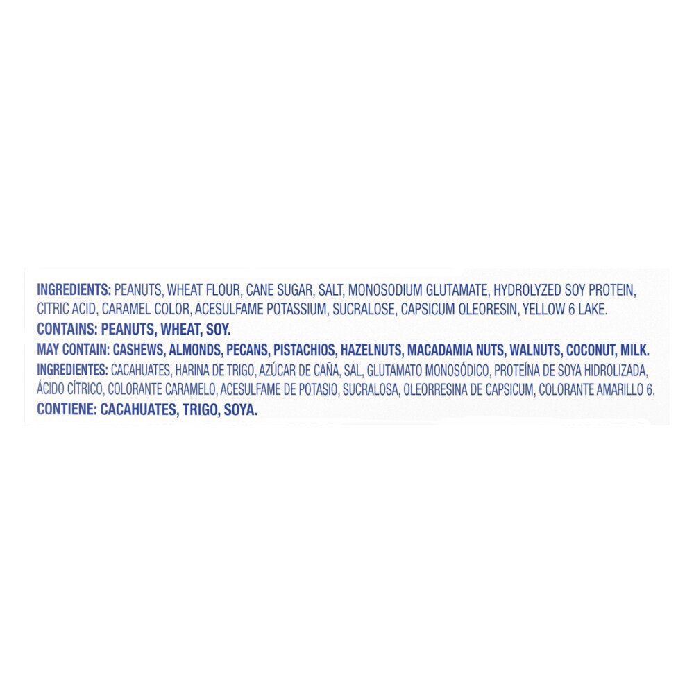Peanuts, Wheat Flour, Cane Sugar, Salt, Monosodium Glutamate, Hydrolyzed Soy Protein, Citric Acid, Caramel Color, Acesulfame Potassium, Sucralose, Capsicum Oleoresin, Yellow 6 Lake.