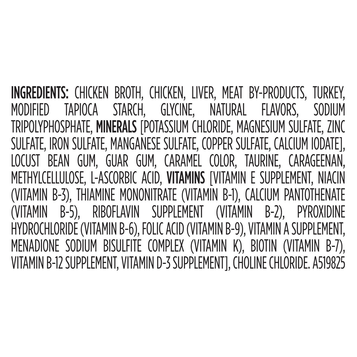 Chicken Broth, Chicken, Liver, Meat By-Products, Turkey, Modified Tapioca Starch, Glycine, Natural Flavors, Sodium Tripolyphosphate, Minerals [Potassium Chloride, Magnesium Sulfate, Zinc Sulfate, Iron…