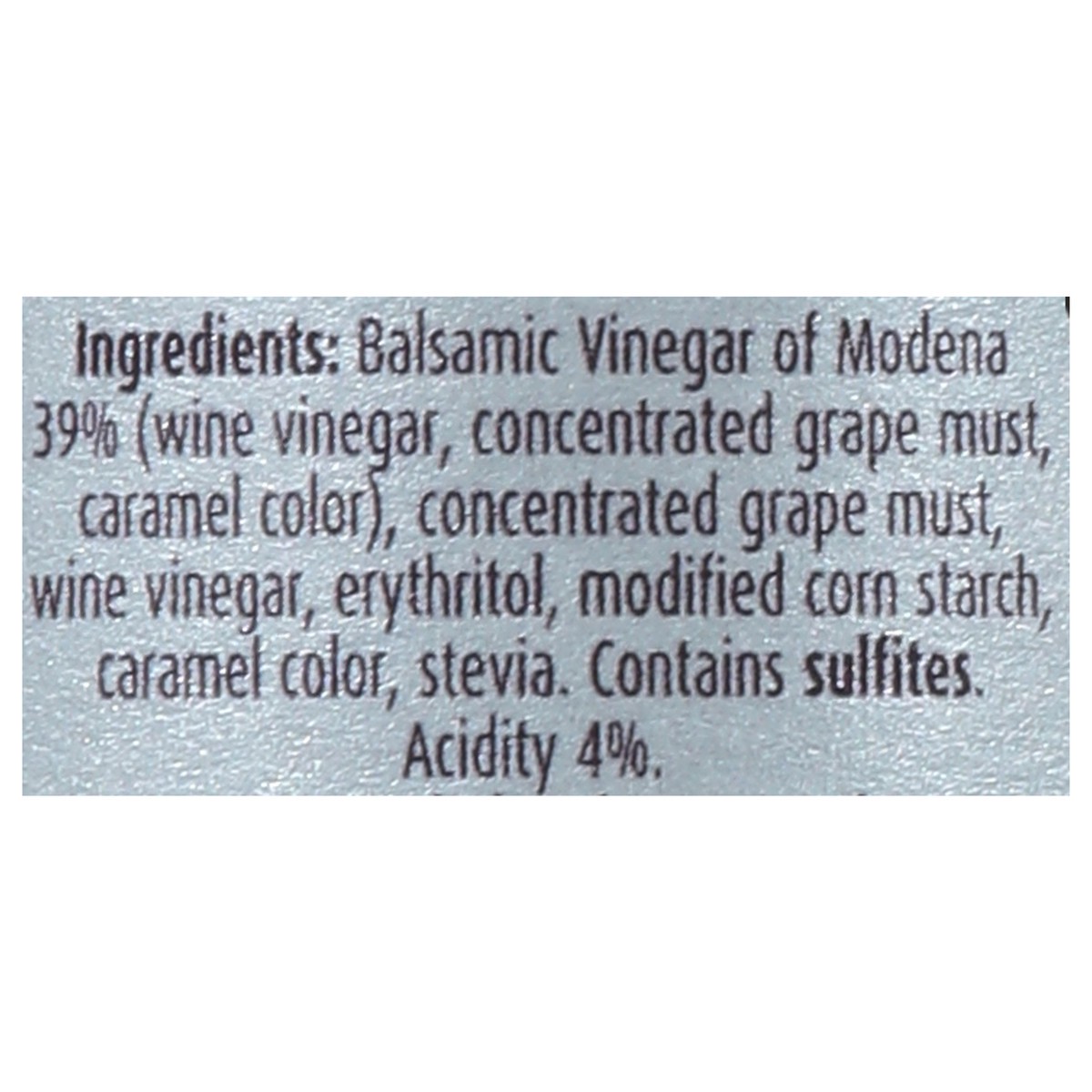 Balsamic Vinegar of Modena 39% (Wine Vinegar, Concentrated Grape Must, Caramel Color), Concentrated Grape Must, Wine Vinegar, Erythritol, Modified Corn Starch, Caramel Color, Stevia.