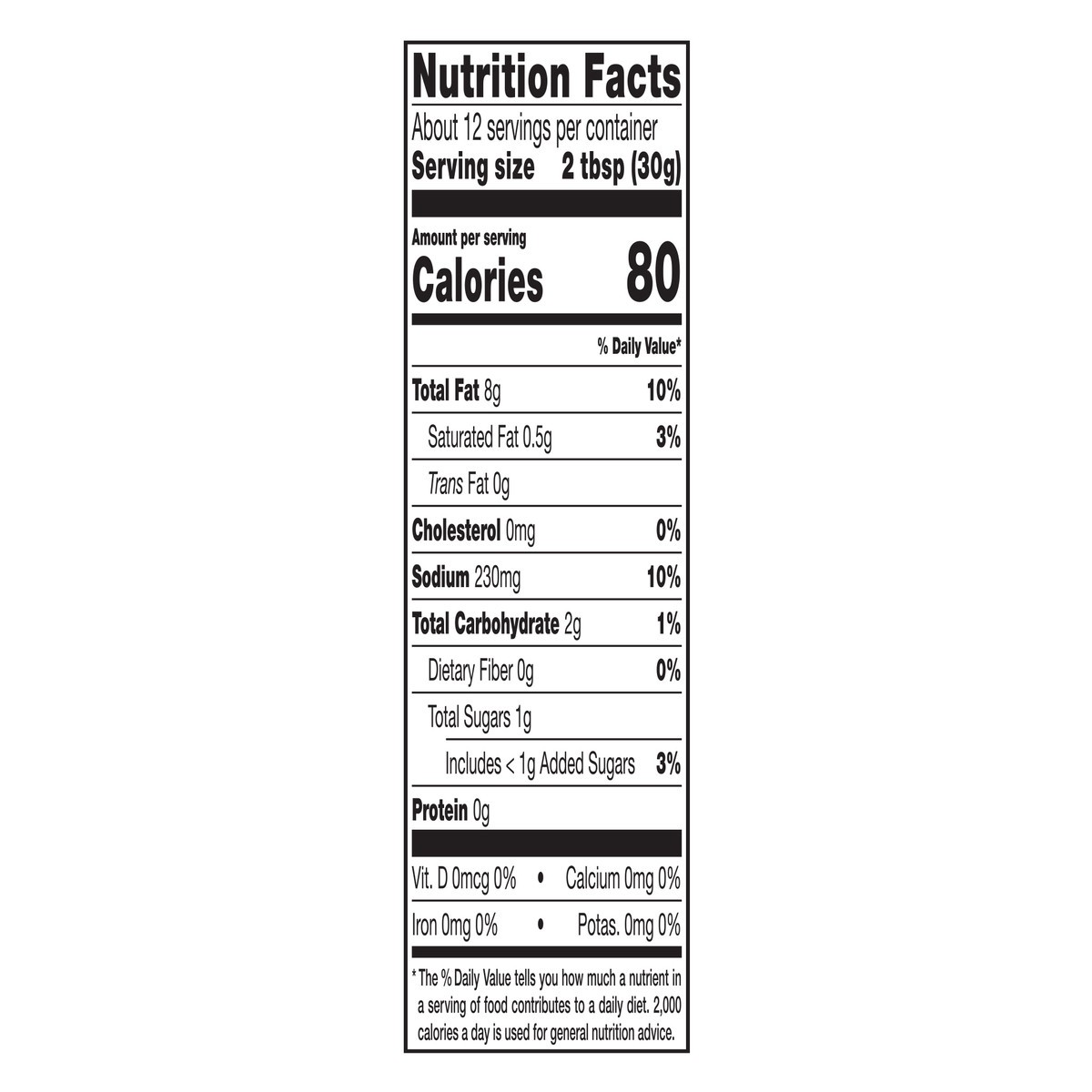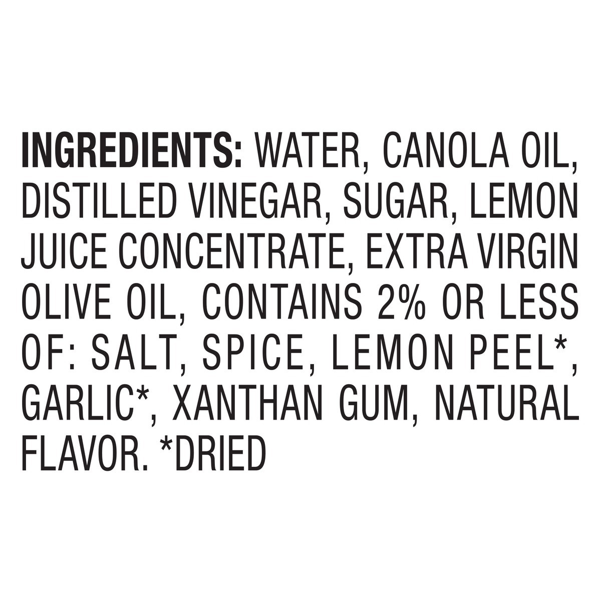 Water, Canola Oil, Distilled Vinegar, Sugar, Lemon Juice Concentrate, Extra Virgin Olive Oil, Contains 2% or Less of: Salt, Spice, Lemon Peel*, Garlic*, Xanthan Gum, Natural Flavor. *Dried.