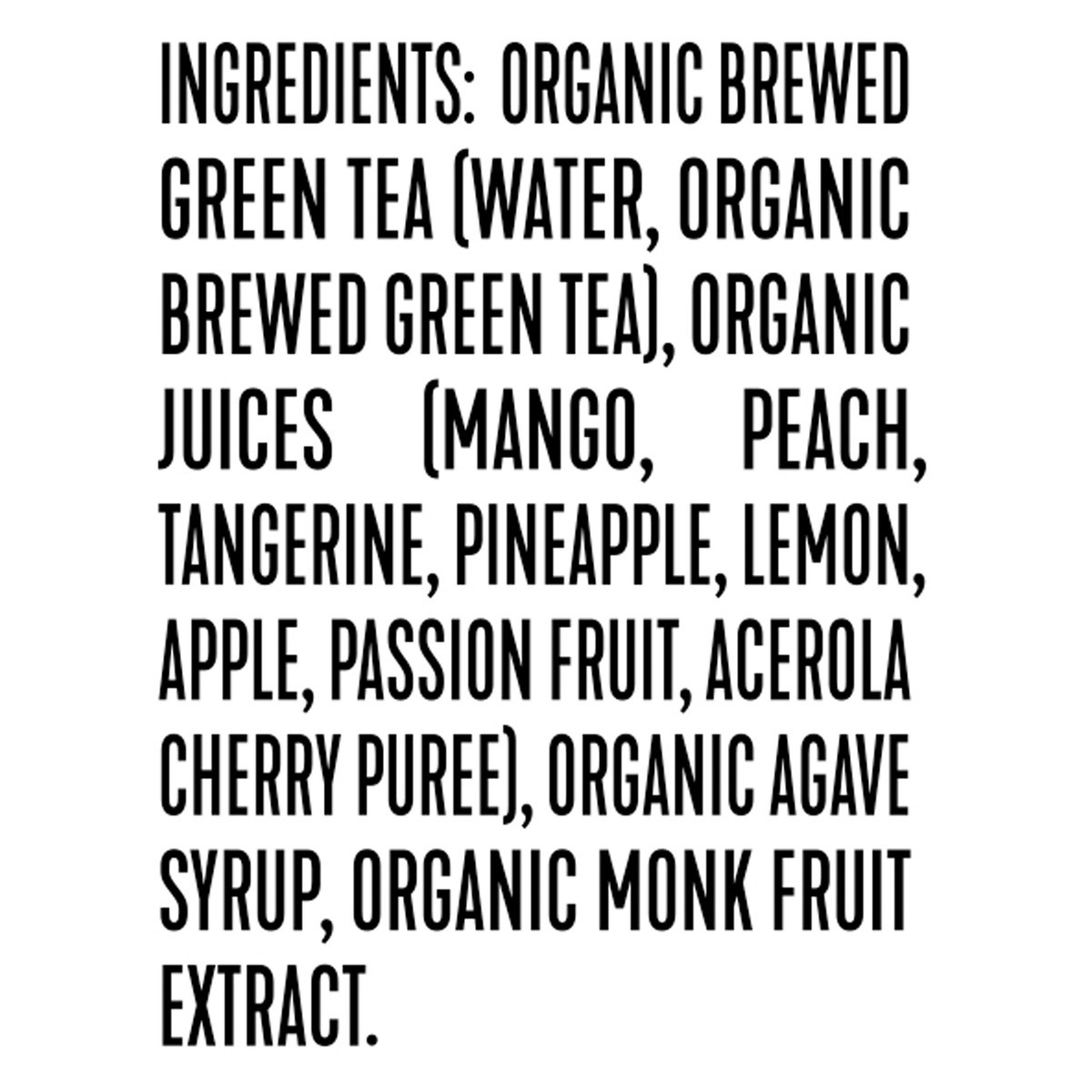 Organic Brewed Green Tea (Water, Organic Brewed Green Tea), Organic Juices (Mango, Peach, Tangerine, Pineapple, Lemon, Apple, Passion Fruit, Acerola Cherry Puree), Organic Agave Syrup, Organic Monk Fr…