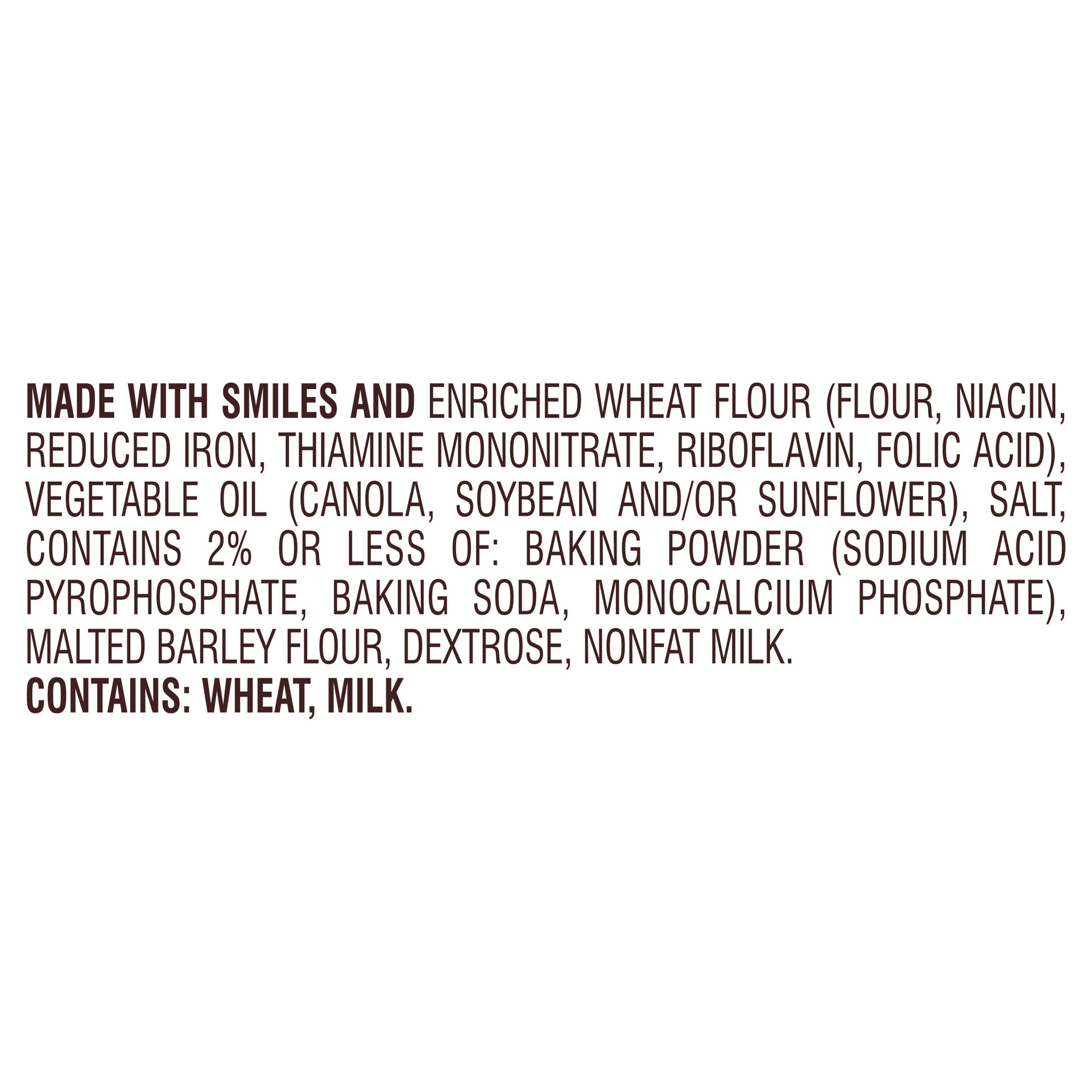 MADE WITH SMILES AND ENRICHED WHEAT FLOUR (FLOUR, NIACIN, REDUCED IRON, THIAMINE MONONITRATE, RIBOFLAVIN, FOLIC ACID), VEGETABLE OIL (CANOLA, SOYBEAN AND/OR SUNFLOWER), SALT, CONTAINS 2% OR LESS OF: B…