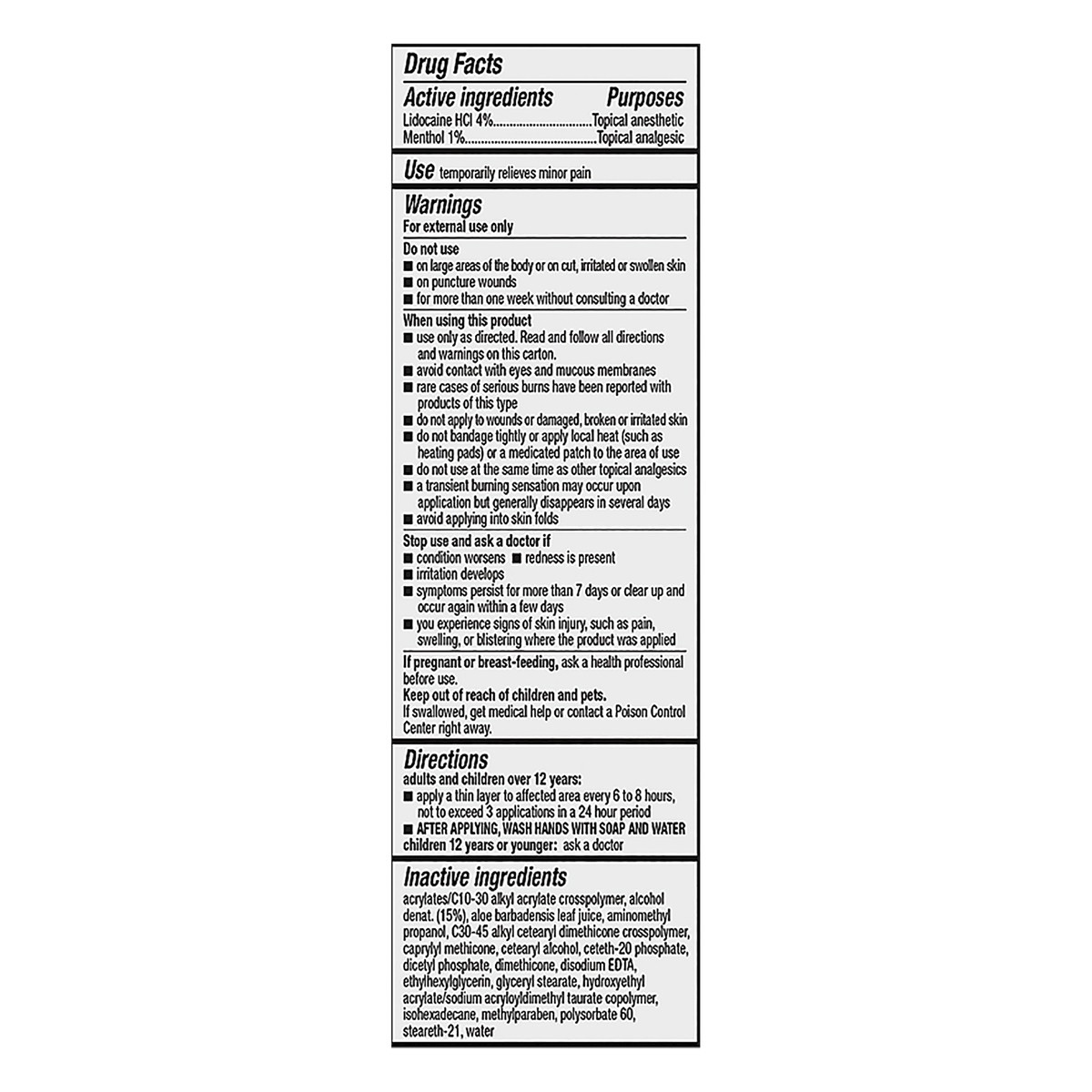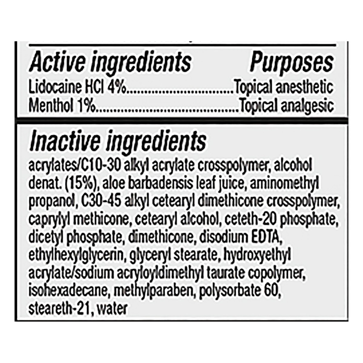 Active Ingredients: Lidocaine (4 %), Topical Anesthetic.; Menthol (1 %), Topical Analgesic. Inactive Ingredients: Acrylates/C10-30 Acrylates Crosspolymer, Alcohol Denat. (15%), Aloe Barbadendsis Leaf …