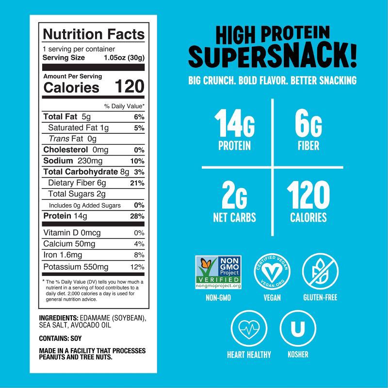 - HIGH PROTEIN SNACK: Packed with 14 grams of complete plant based protein with just 120 calories and 6 grams of fiber. Packaged in convenient resealable bags perfect for the gym, as office snacks, or as a protein packed lunchbox snack — these Crunchy Roasted Edamame Bean Snacks crunch above their weight class. Delicious and bold Sea Salt flavor!