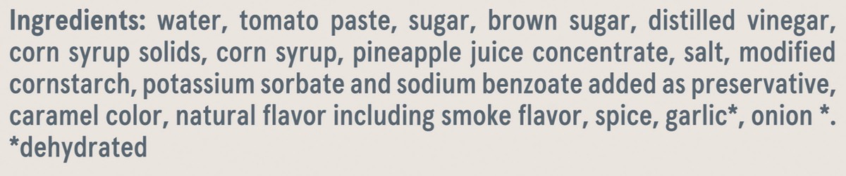 Water, Tomato Paste, Sugar, Brown Sugar, Distilled Vinegar, Corn Syrup Solids, Corn Syrup, Pineapple Juice Concentrate, Salt, Modified Cornstarch, Potassium Sorbate and Sodium Benzoate Added as Preser…