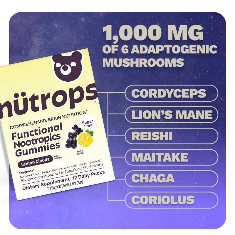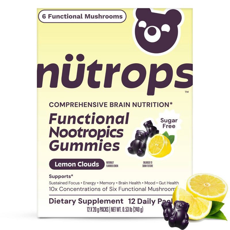 - COMPREHENSIVE NUTRITION FOR BRAIN HEALTH: Gruns Nutrops are formulated with six types of mushrooms to support overall cognitive health. These refreshing Lemon flavored gummies are designed to enhance focus, Cognitive support, promote mental clarity, support Memory, and tackle the afternoon slump. Even better in supporting long-term brain health and fighting against Neurodegenerative risk.