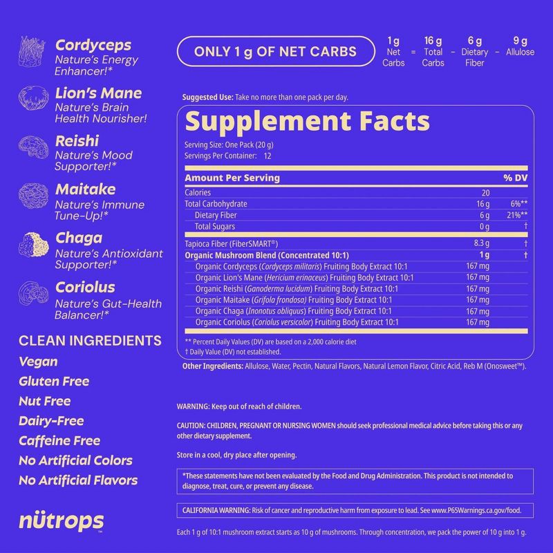 - 10,000mg MUSHROOM BLEND: Nütrops feature Lion's Mane, Cordyceps, Reishi, Maitake, Chaga, and Coriolus. Each mushroom carefully selected for their unique properties to create the perfect wholistic support blend. Designed for cognitive function, energy, brain health, mood, sleep, and gut health support.