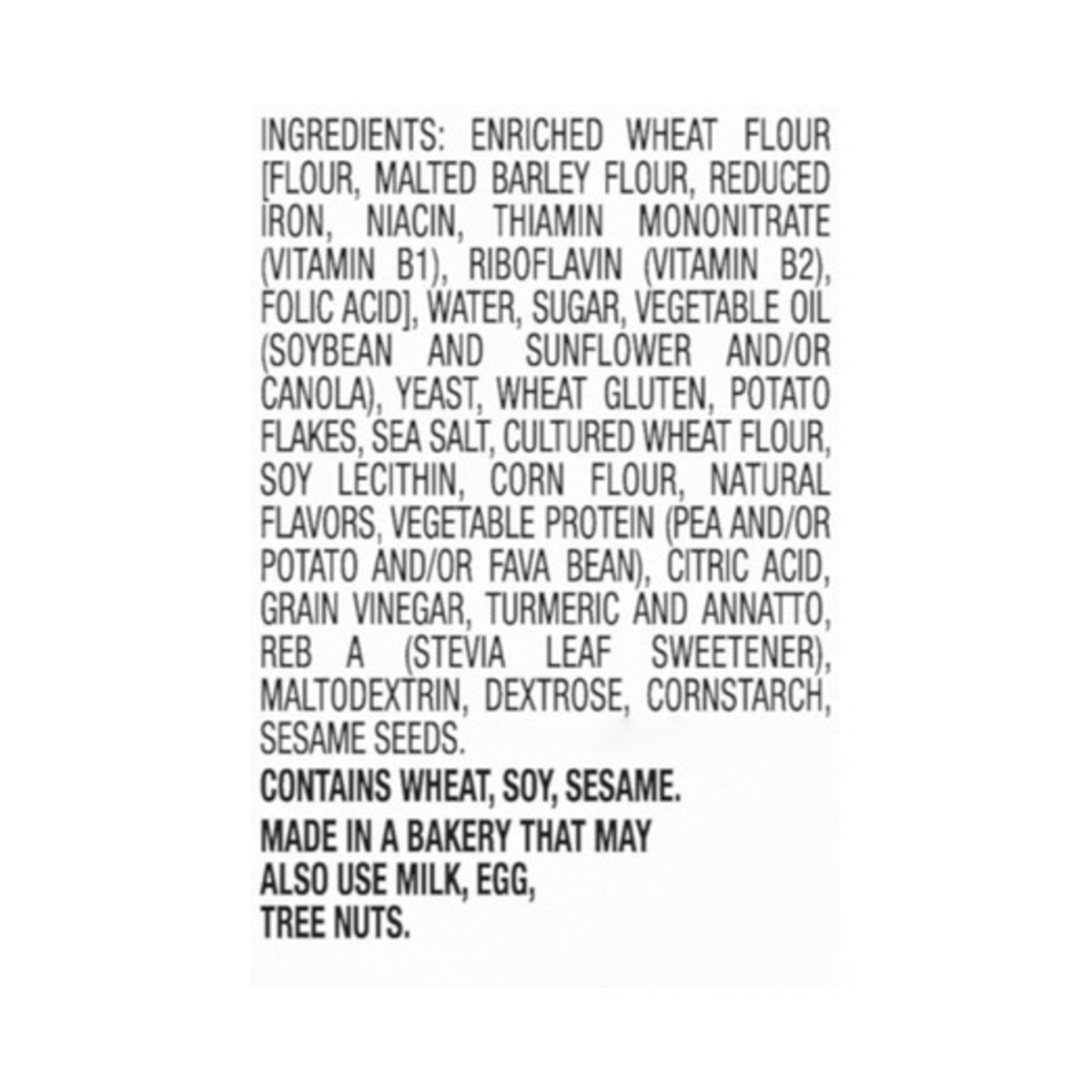 "UNBLEACHED ENRICHED WHEAT FLOUR [FLOUR, MALTED BARLEY FLOUR, REDUCED IRON, NIACIN, THIAMIN MONONITRATE (VITAMIN B1), RIBOFLAVIN (VITAMIN B2), FOLIC ACID], WATER, SUGAR, WHEAT GLUTEN, YEAST. POTATO FL…