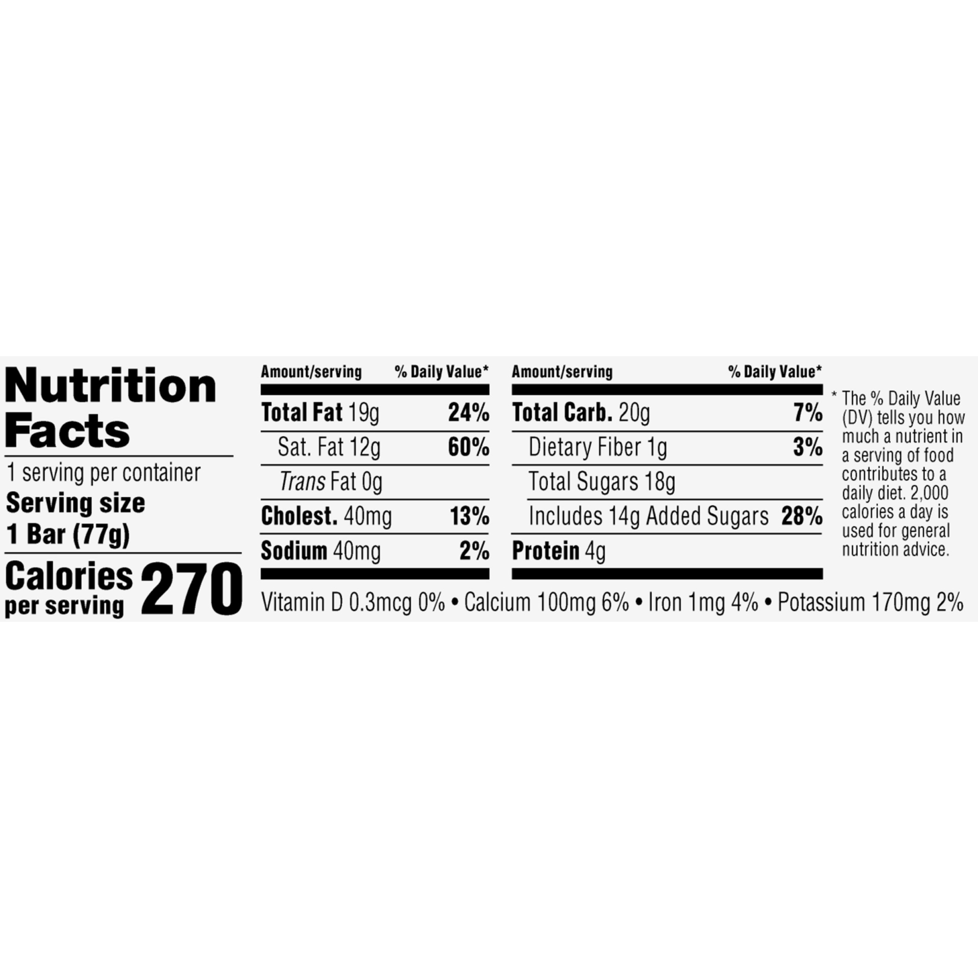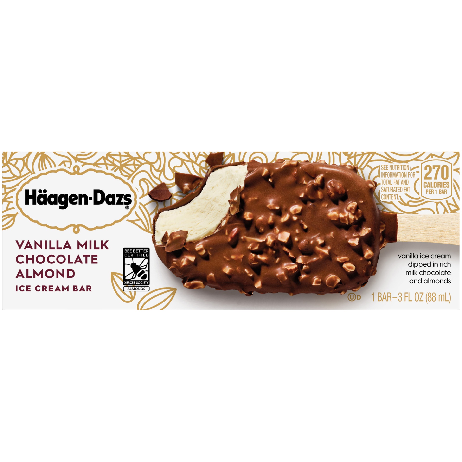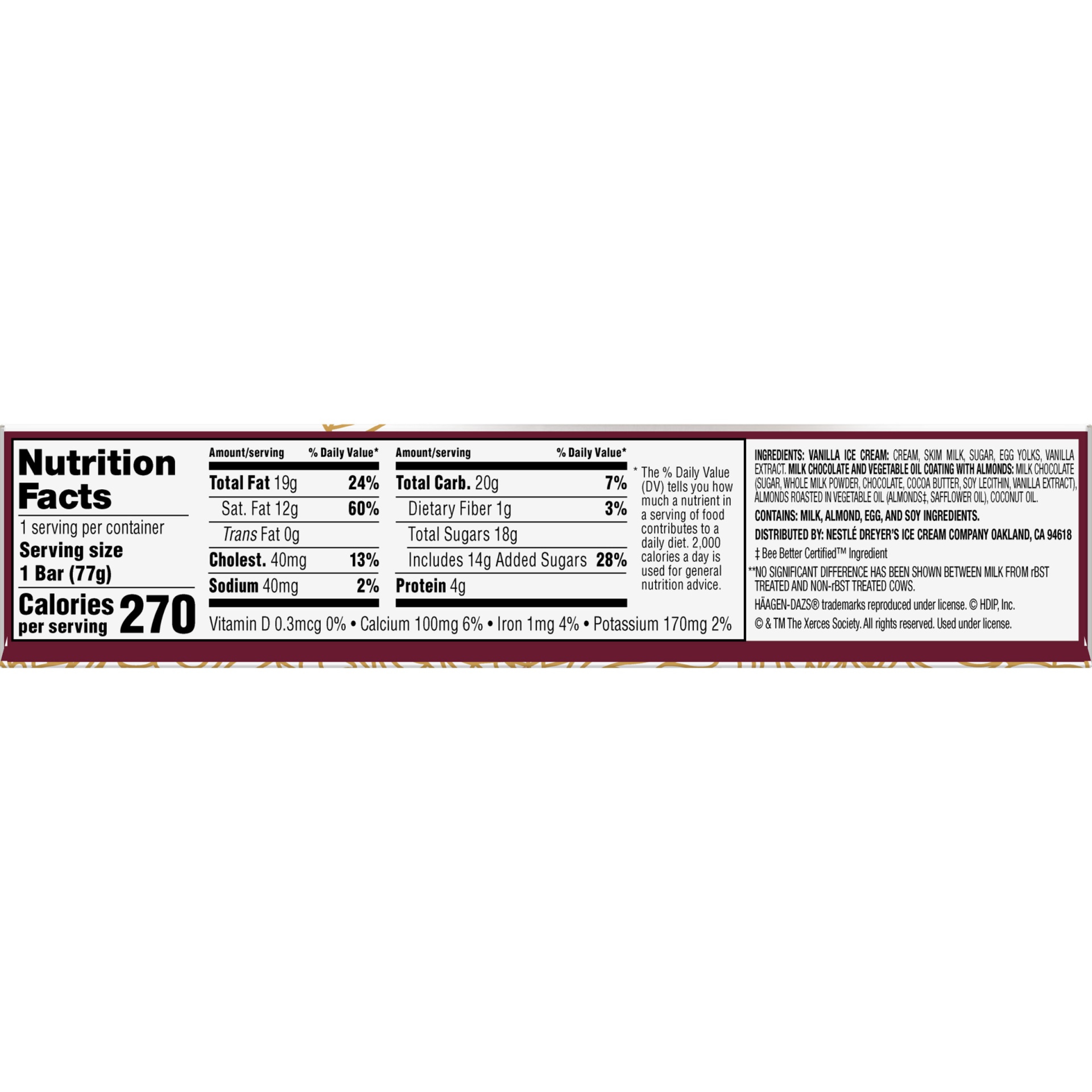 Vanilla Ice Cream: Cream, Skim Milk, Sugar, Egg Yolks, Vanilla Extract. Milk Chocolate and Vegetable Oil Coating with Almonds: Milk Chocolate (Sugar, Whole Milk Powder, Chocolate, Cocoa Butter, Soy Le…