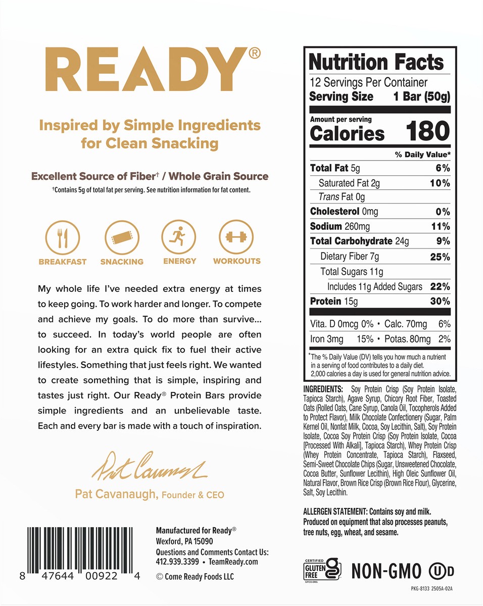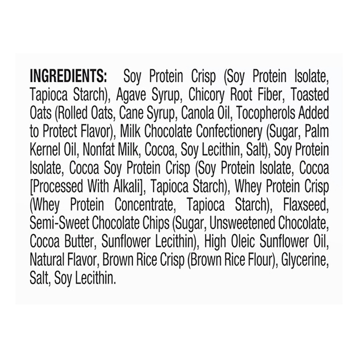 Soy Protein Crisp (Soy Protein Isolate, Tapioca Starch), Agave Syrup, Chicory Root Fiber, Toasted Oats (Rolled Oats, Cane Syrup, Canola Oil, Tocopherols Added to Protect Flavor), Milk Chocolate Confec…