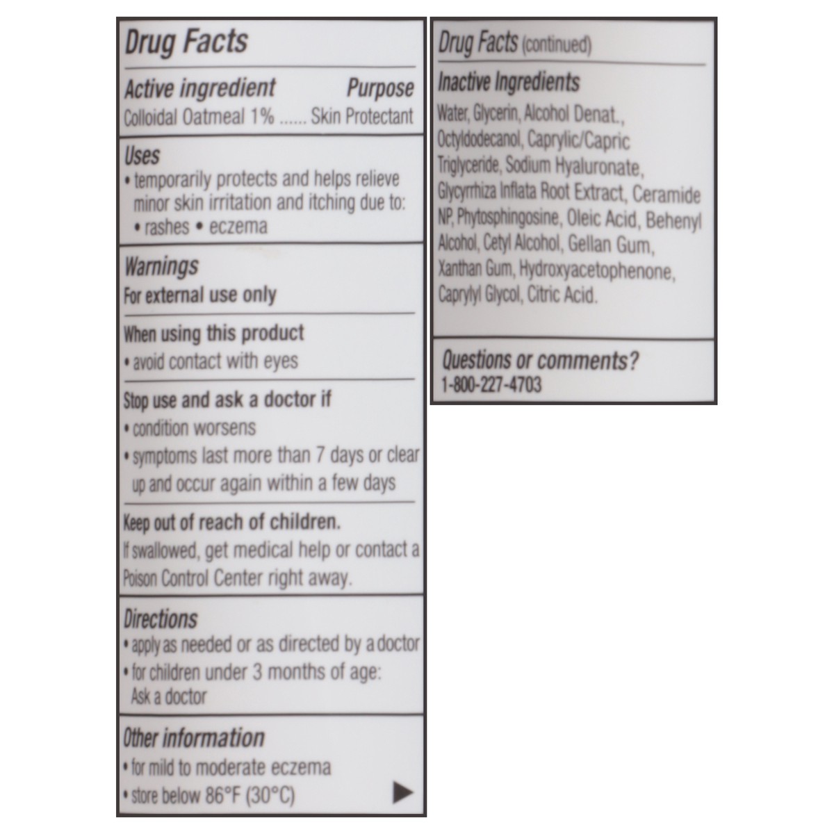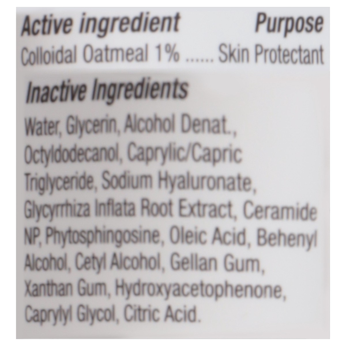 Active Ingredients: Colloidal Oatmeal (1 %), Skin Protectant. Inactive Ingredients: Water, Glycerin, Alcohol Denat., Octyldodecanol, Caprylic/Capric Triglyceride, Sodium Hyaluronate, Glycyrrhiza Infla…