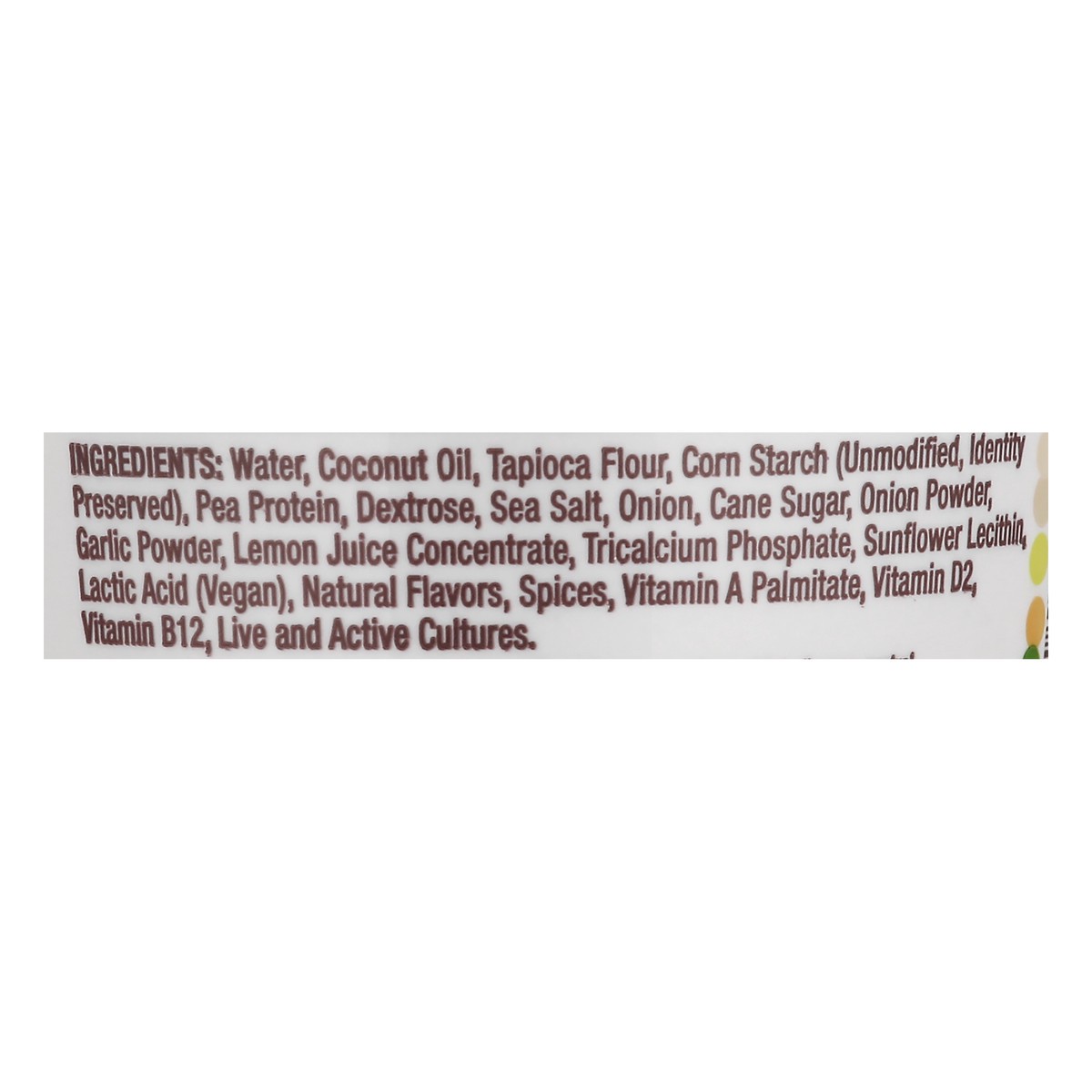Water, Coconut Oil, Tapioca Flour, Corn Starch (Unmodified, Identity Preserved), Pea Protein, Dextrose, Sea Salt, Onion, Cane Sugar, Onion Powder, Garlic Powder, Lemon Juice Concentrate, Tricalcium Ph…