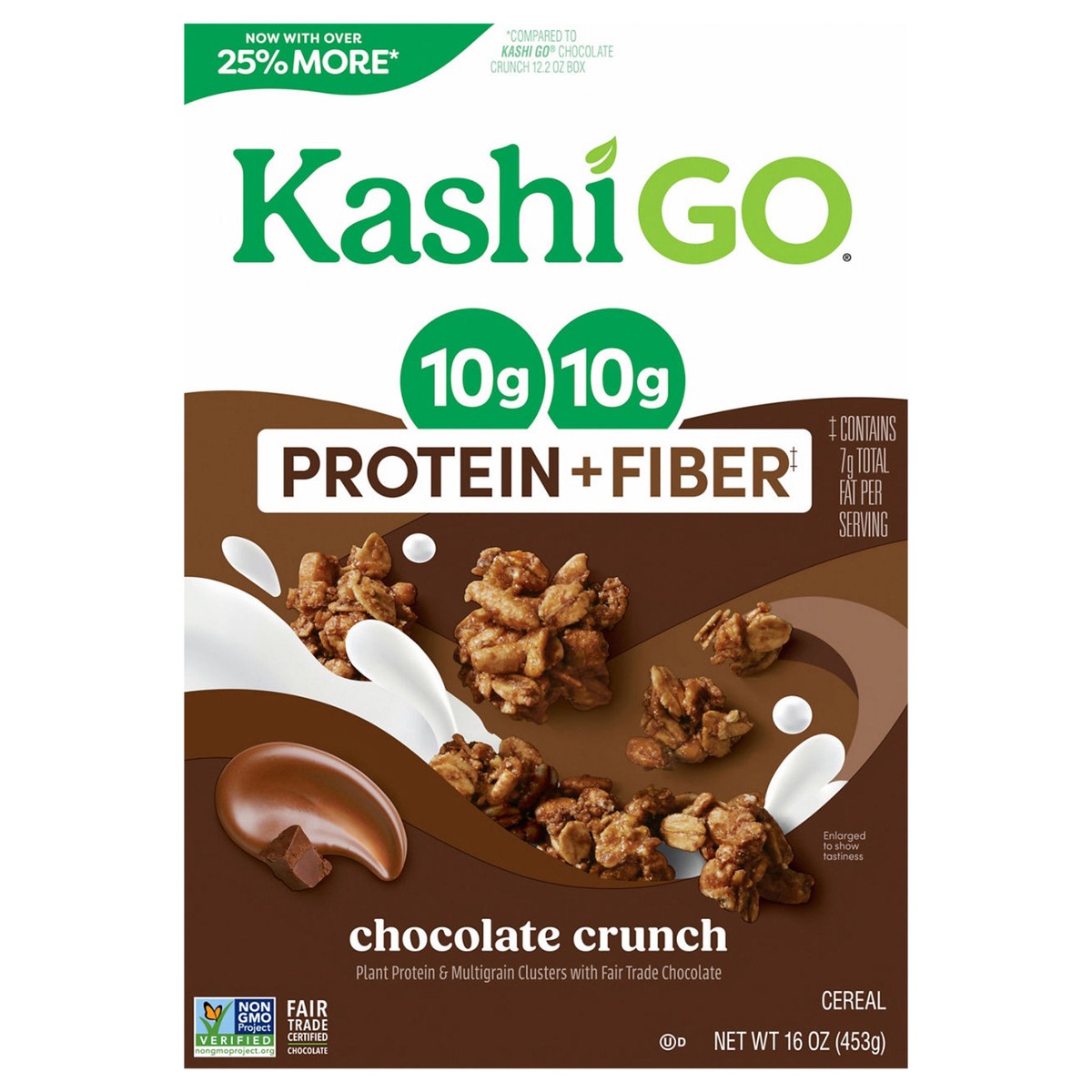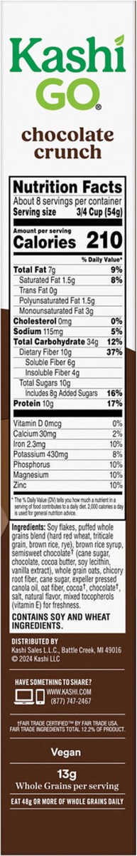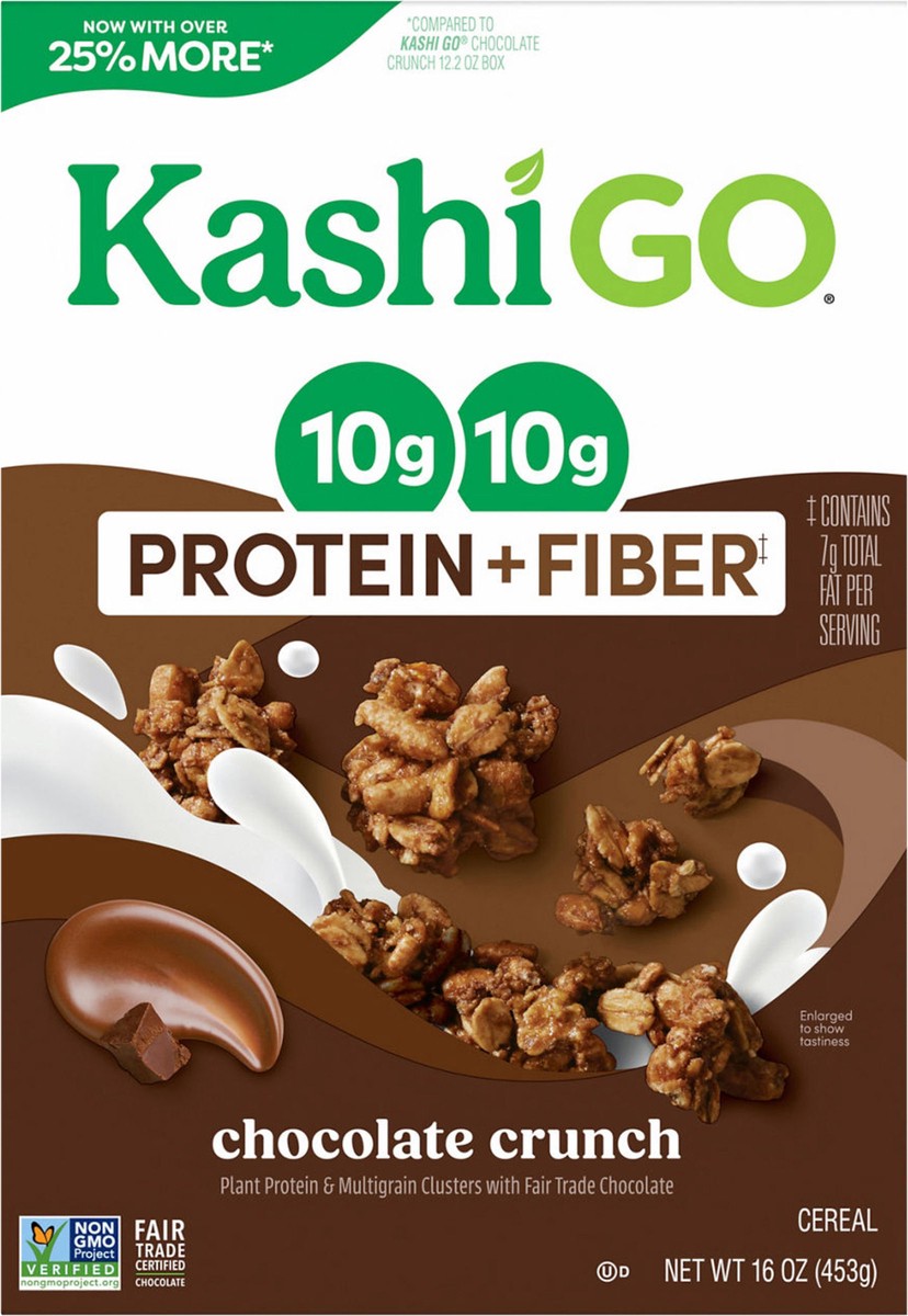 Get up and go with the delicious taste of rich Fair Trade chocolate and whole grains in Kashi GO Chocolate Crunch protein cereal. Whether it's part of your breakfast or a midday snack, this vegan cere…