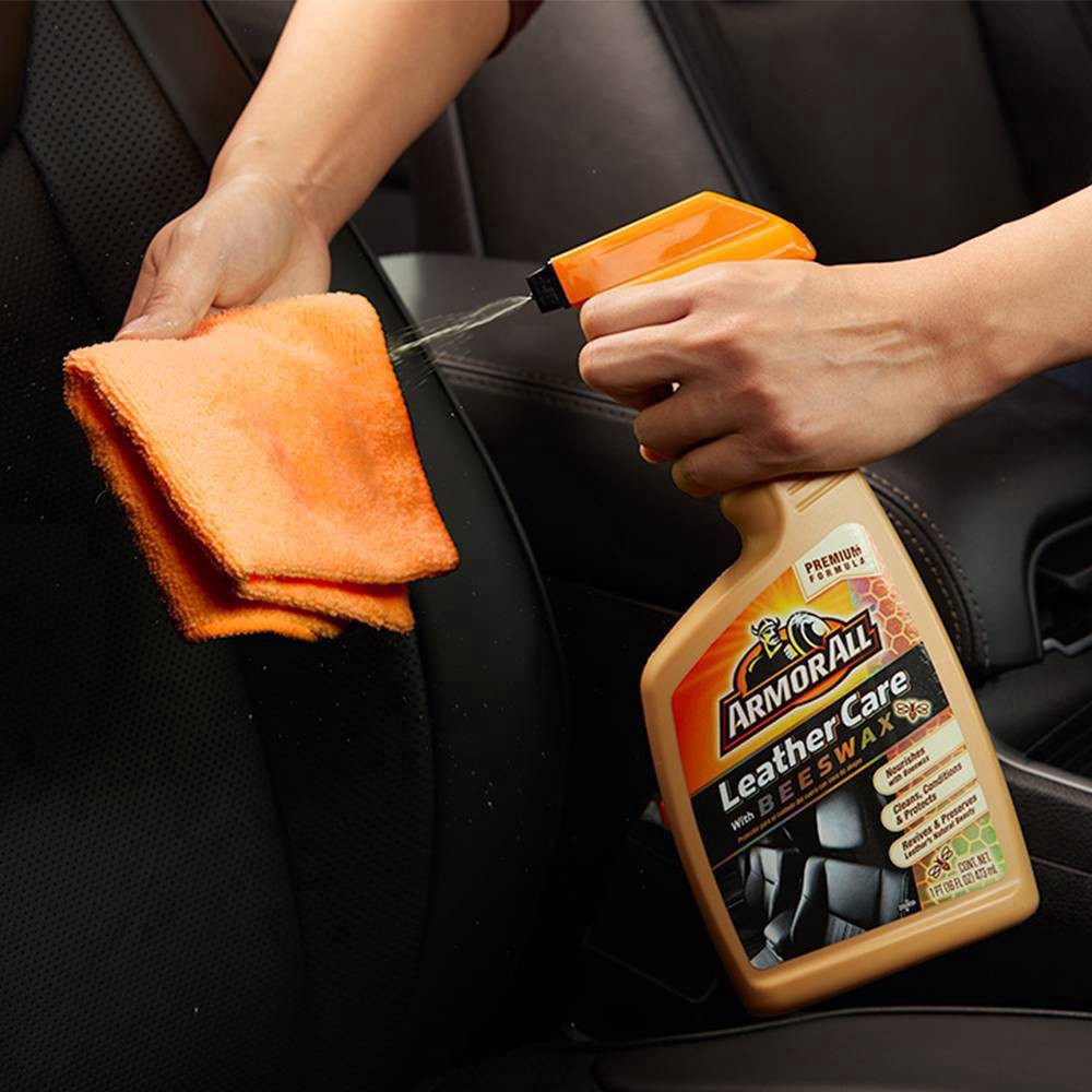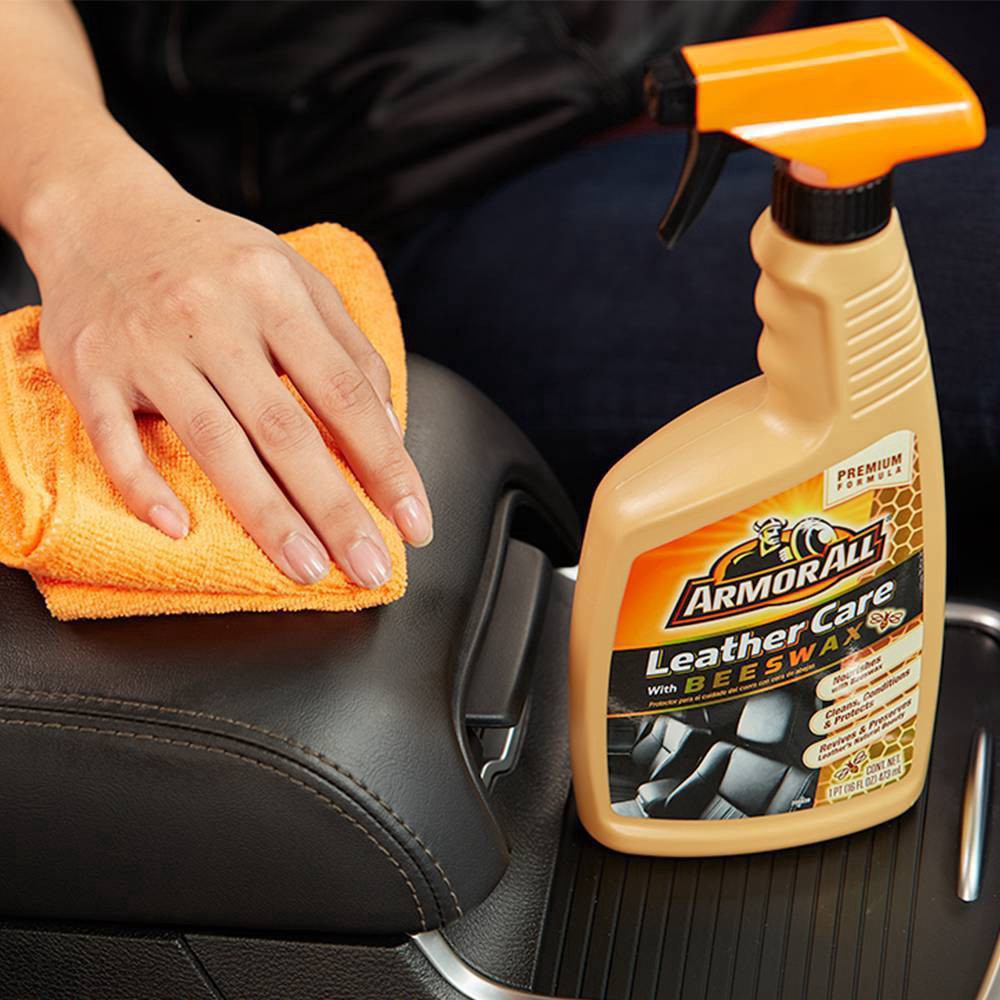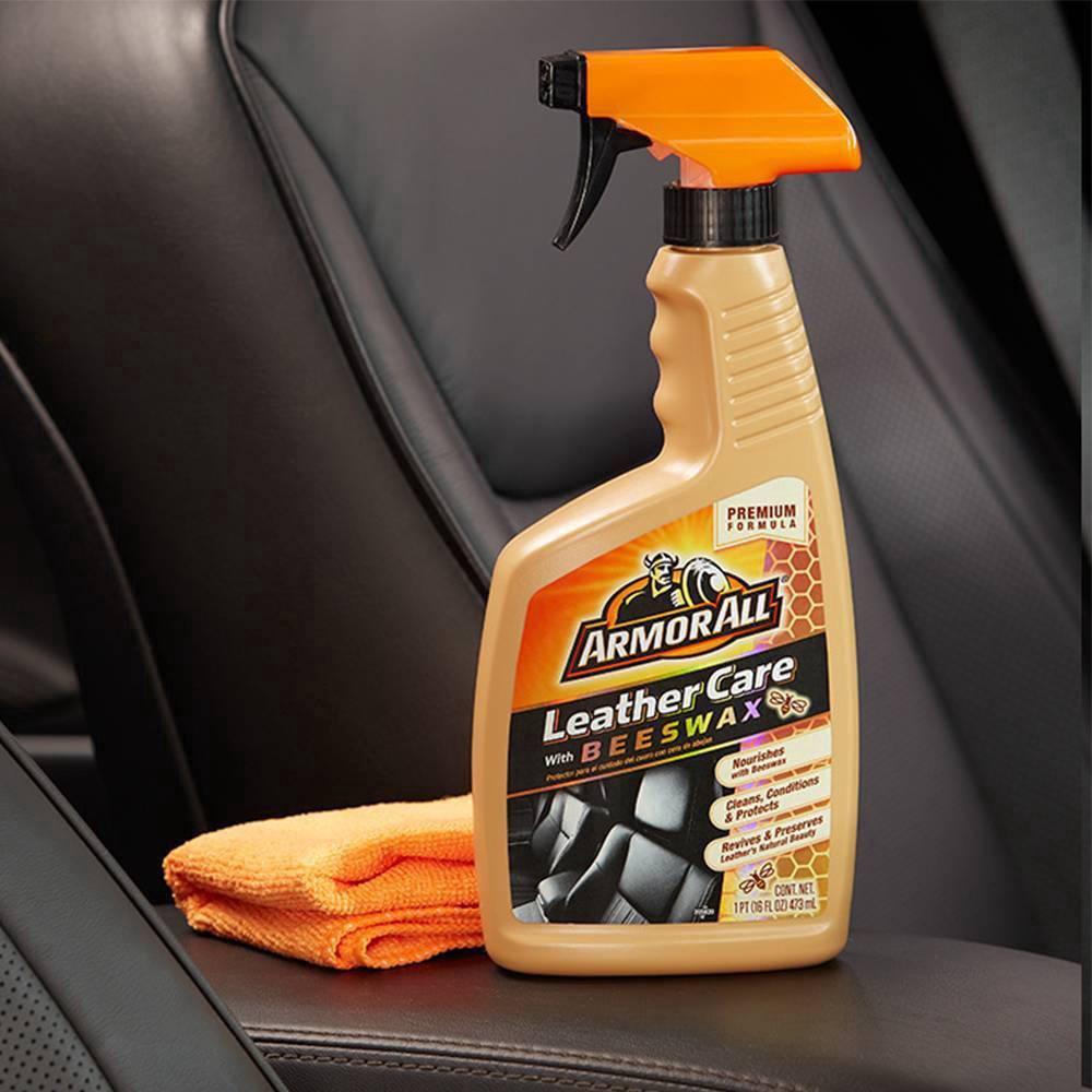 - Nourish leather with the real beeswax found in Armor All Leather Care With Beeswax. Genuine leather can face harsh conditions inside your car, including heat, humidity and sunlight. Real beeswax is blended into this spray cleaner to preserve leather''s supple feel and rich look. Specially formulated as a car upholstery cleaner, this leather spray cleans, conditions and protects in one application. The leather cleaner removes dirt and soil to effectively clean the grain. Then leather conditioner restores the supple feel and rich beauty. Finally, leather protectant helps preserve and safeguard against drying, aging and cracking. Apply this car interior cleaner to your car''s leather surfaces to revive their luxurious look and provide lasting protection.