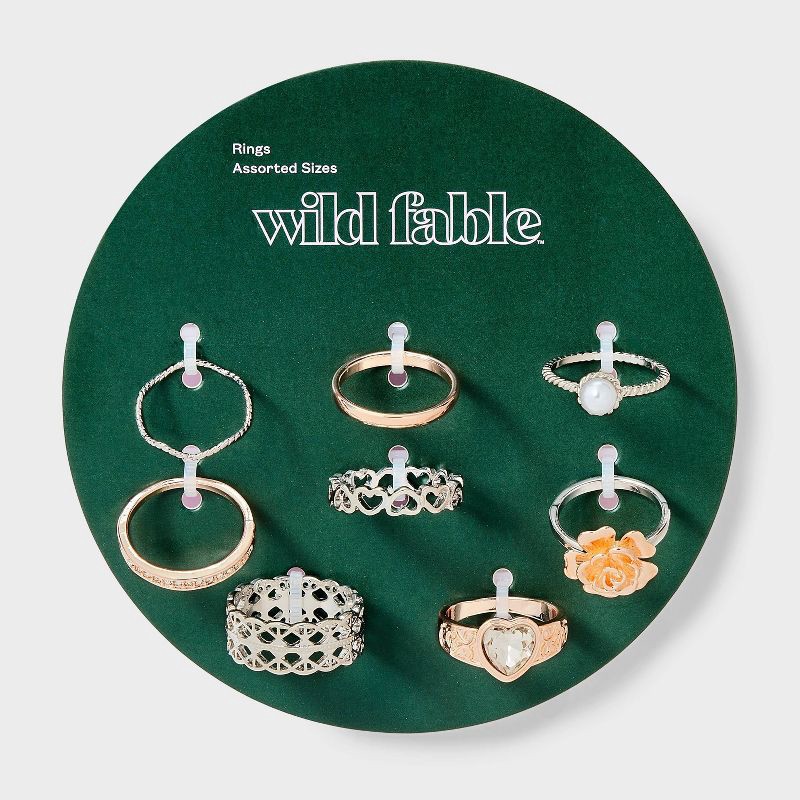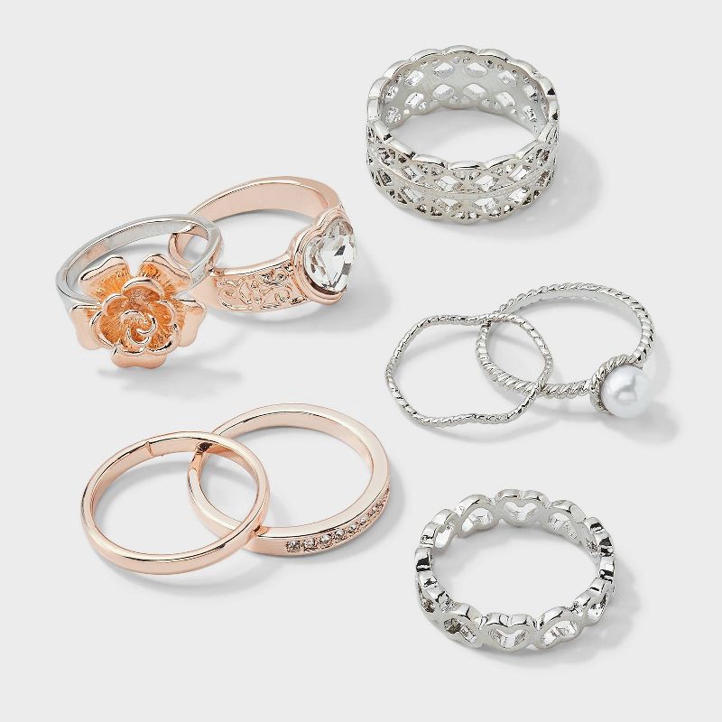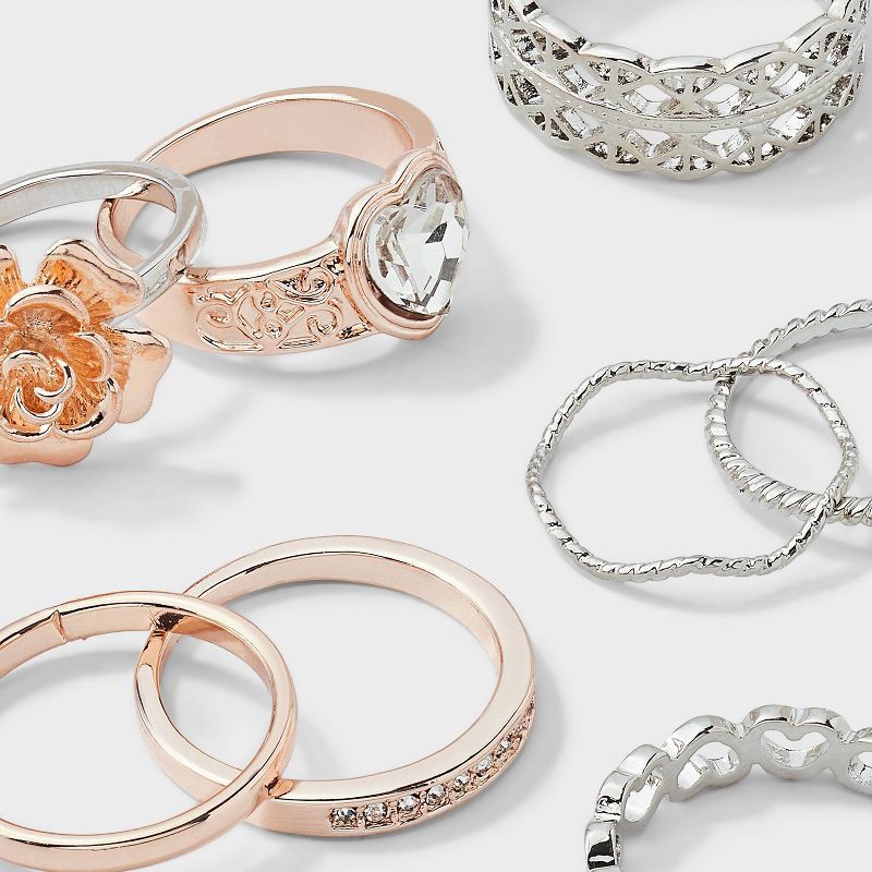 Eight-piece heart and flower ring set from Wild Fable™ in mix metal finishes. Includes three rose gold-tone rings, four silver-tone rings in assorted styles plus one silver-tone band with a rose gold …