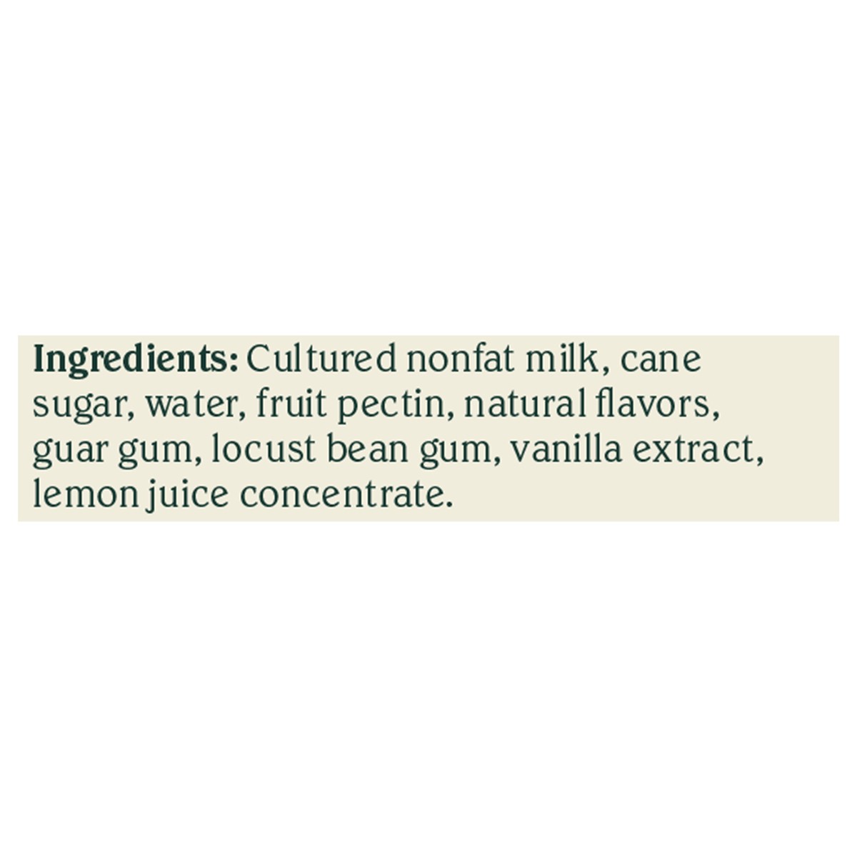 Cultured Nonfat Milk, Cane Sugar, Water, Fruit Pectin, Natural Flavors, Guar Gum, Locust Bean Gum, Vanilla Extract, Lemon Juice Concentrate, 6 Live and Active Cultures: S. Thermophilus, L. Bulgaricus,…