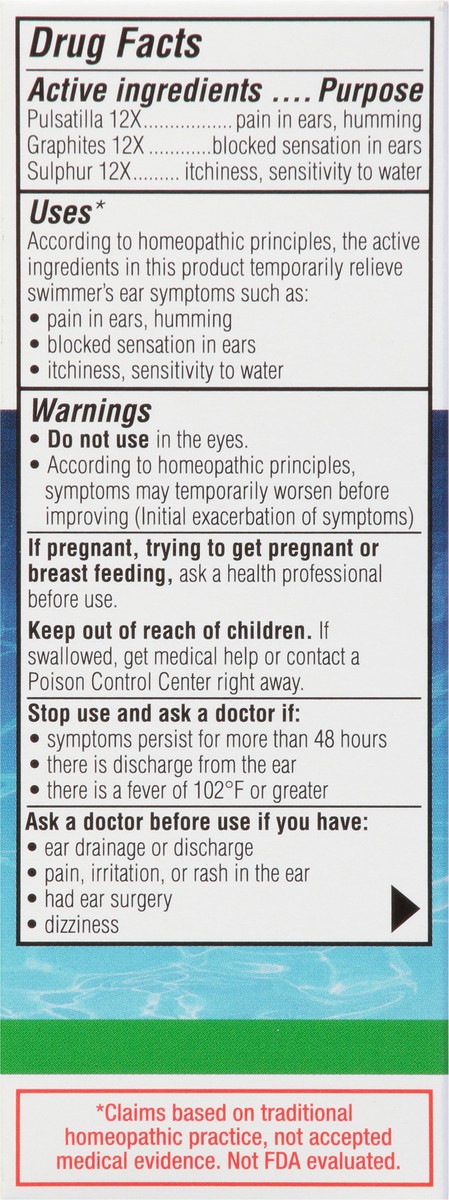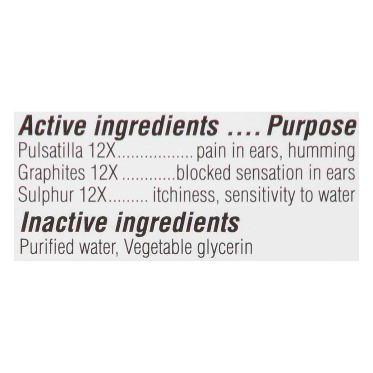 Active Ingredients: Pulsatilla 12X, Pain in Ears, Humming; Graphites 12X, Blocked Sensation in Ears; Sulphur 12X, Itchiness, Sensitivity to Water. Inactive Ingredients: Purified Water, Vegetable Glyce…