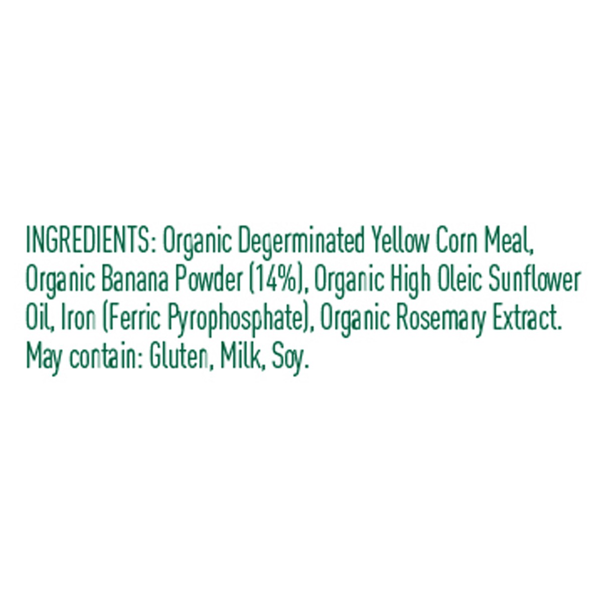 Organic Degerminated Yellow Corn Meal, Organic Banana Powder (14%), Organic High Oleic Sunflower Oil, Iron (Ferric Pyrophosphate), Organic Rosemary Extract.