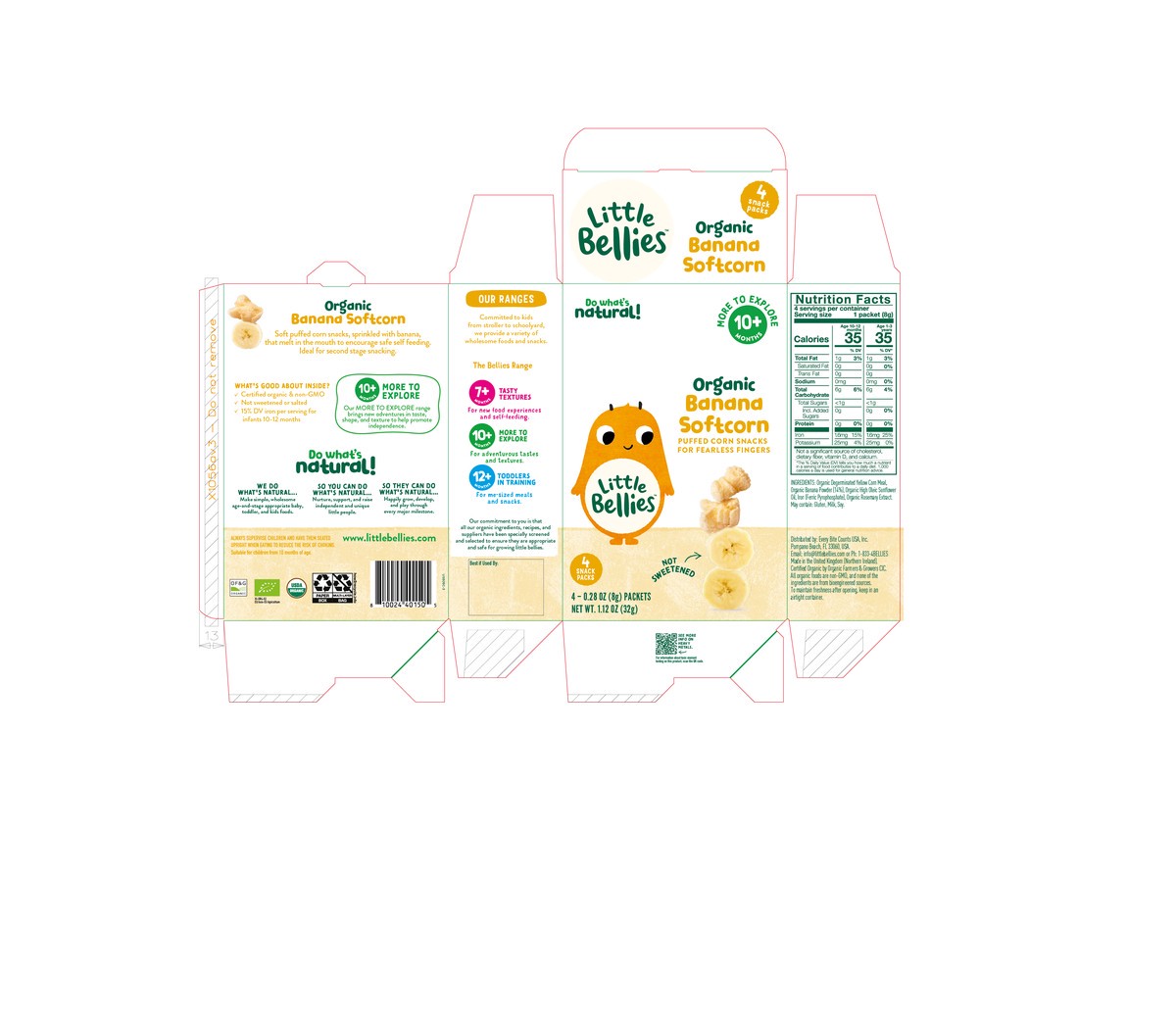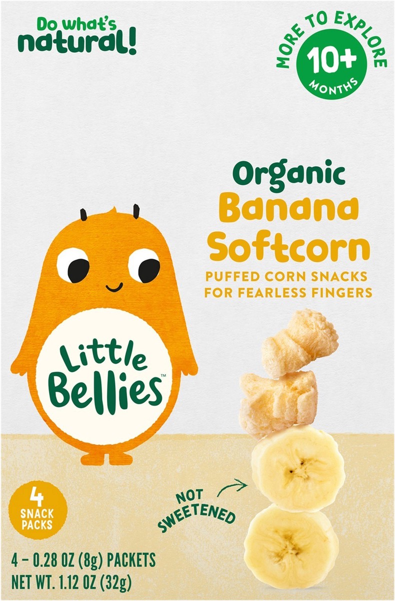 Deliciously crisp organic puffed corn snacks lightly sprinkled with banana. Baby Bellies Organic Banana softcorn gently melts in the mouth for safe selffeeding, just right for second stage snacking.Ou…