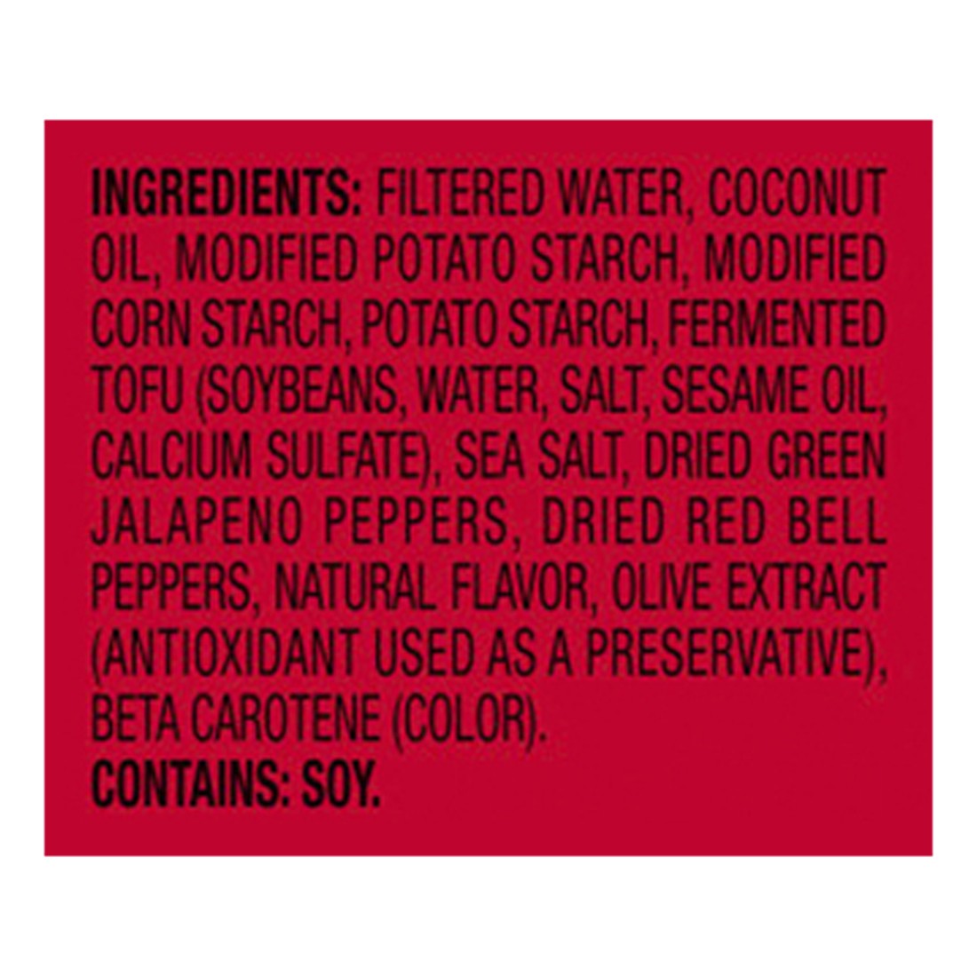 Filtered Water, Coconut Oil, Modified Potato And Corn Starch, Potato Starch, Fermented Tofu (Soybeans, Water, Salt, Sesame Oil, Sea Salt, Dried Green Jalapeño Peppers, Dried Bell Peppers, Natural Flav…