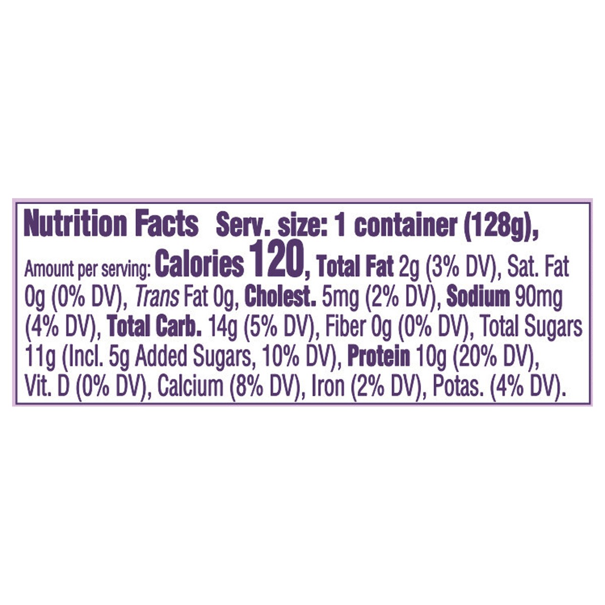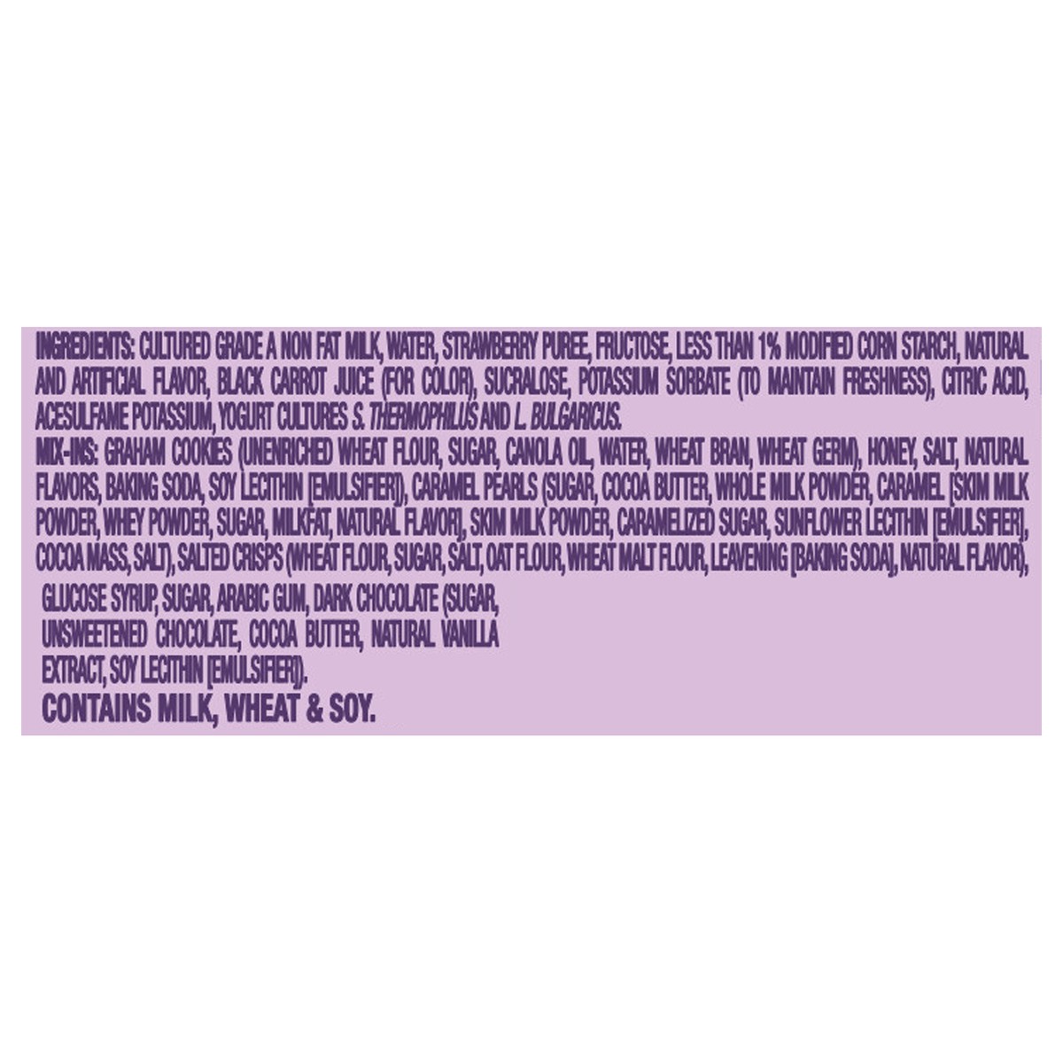 Cultured Grade A Non Fat Milk, Water, Strawberry Puree, Fructose, Less than 1% Modified Corn Starch, Natural and Artificial Flavor, Black Carrot Juice (for Color), Sucralose, Potassium Sorbate (to Mai…