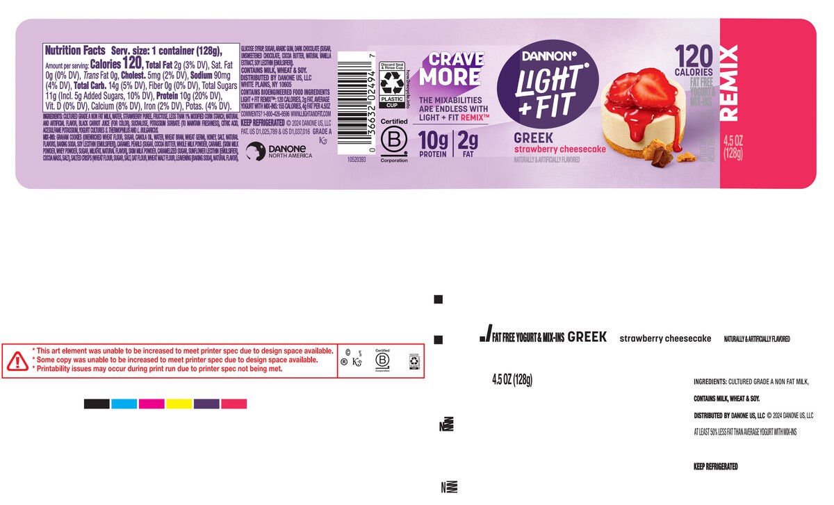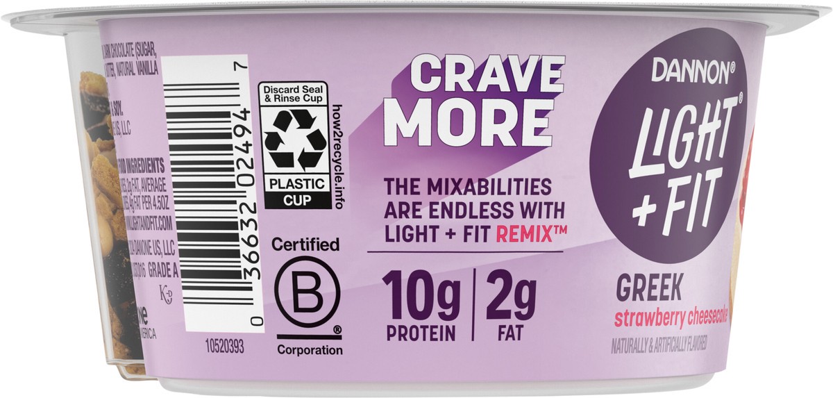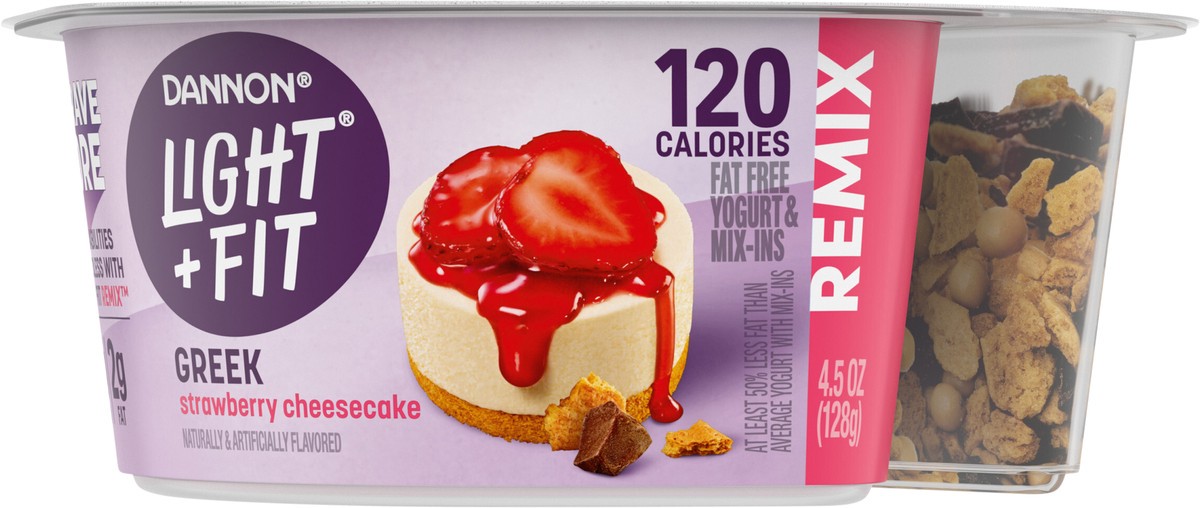 - JUST GRAB YOUR SPOON AND ENJOY: One 4.5 oz cup of Dannon Light + Fit REMIX Strawberry Cheesecake Fat Free Greek Yogurt
