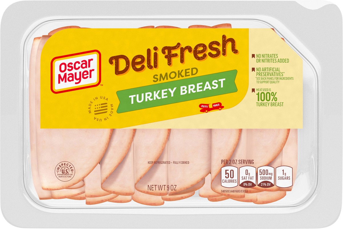 Make a delicious deli sandwich at home with Oscar Mayer Deli Fresh Smoked Turkey Breast Sliced Lunch Meat. Our quality turkey deli meat is 98% fat-free and made with no artificial preservatives, see b…