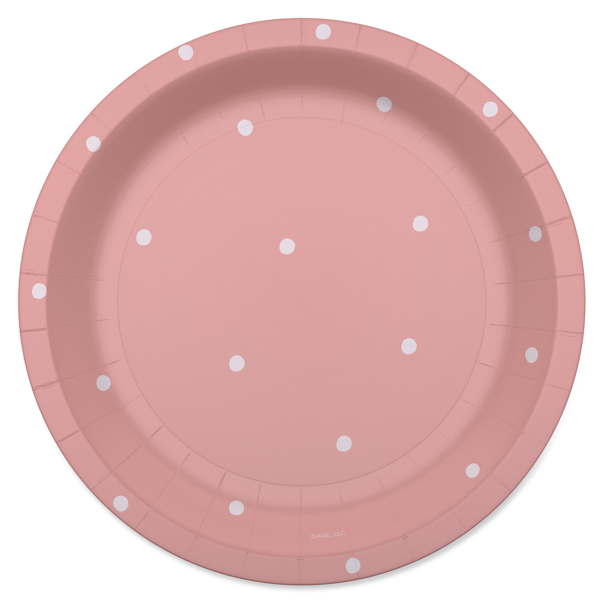 - This American Greetings round 7" birthday plate features scattered dots on a solid pink background