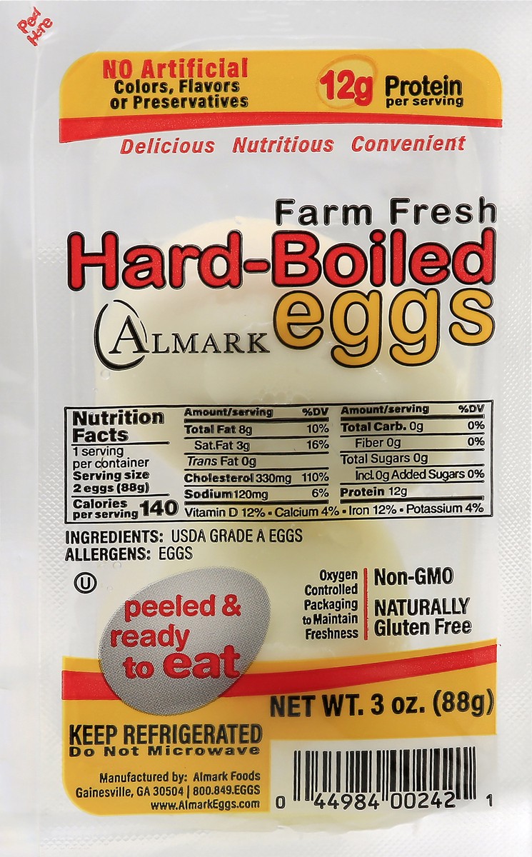 No artificial colors, flavors or preservatives. 12 g protein per serving. Naturally Gluten free. Non-GMO. Delicious. Nutritious. Convenient. Peeled & ready to eat. www.AlmarkEggs.com. Oxygen controlle…