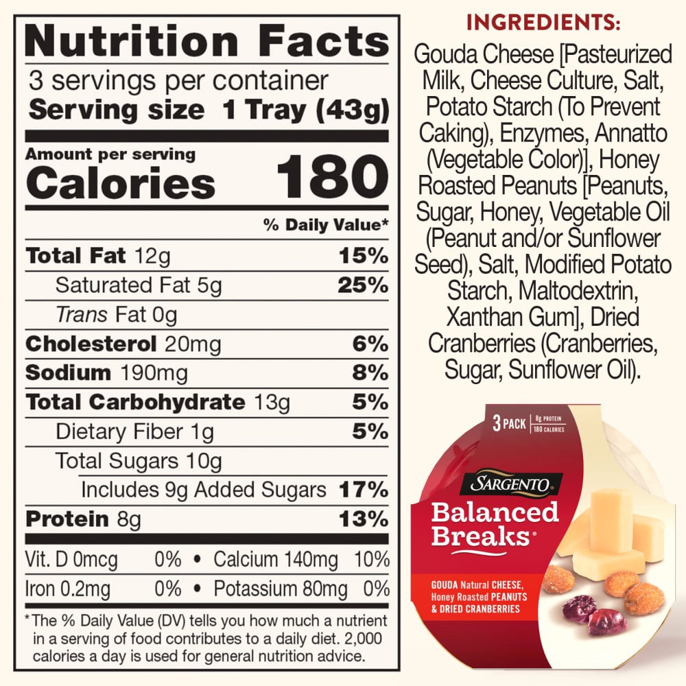 Gouda Cheese [Pasteurized Milk, Cheese Culture, Salt, Potato Starch (to Prevent Caking), Enzymes, Annatto (Vegetable Color)], Honey Roasted Peanuts [Peanuts, Sugar, Honey, Vegetable Oil (Peanut and/or…