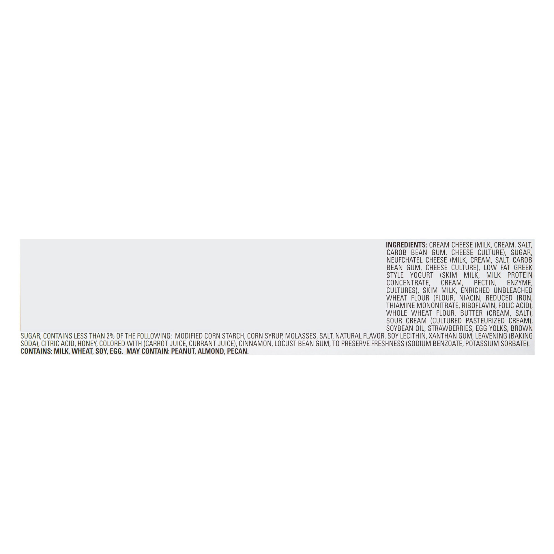 CREAM CHEESE (MILK, CREAM, SALT, CAROB BEAN GUM, CHEESE CULTURE), NEUFCHATEL CHEESE (MILK, CREAM, SALT, CAROB BEAN GUM, CHEESE CULTURE), SUGAR, LOW FAT GREEK STYLE YOGURT (SKIM MILK, MILK PROTEIN CONC…
