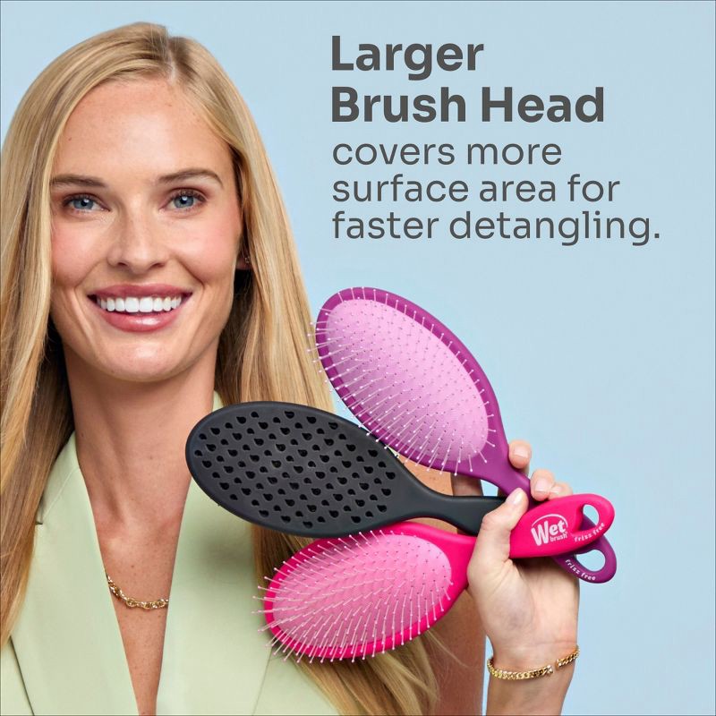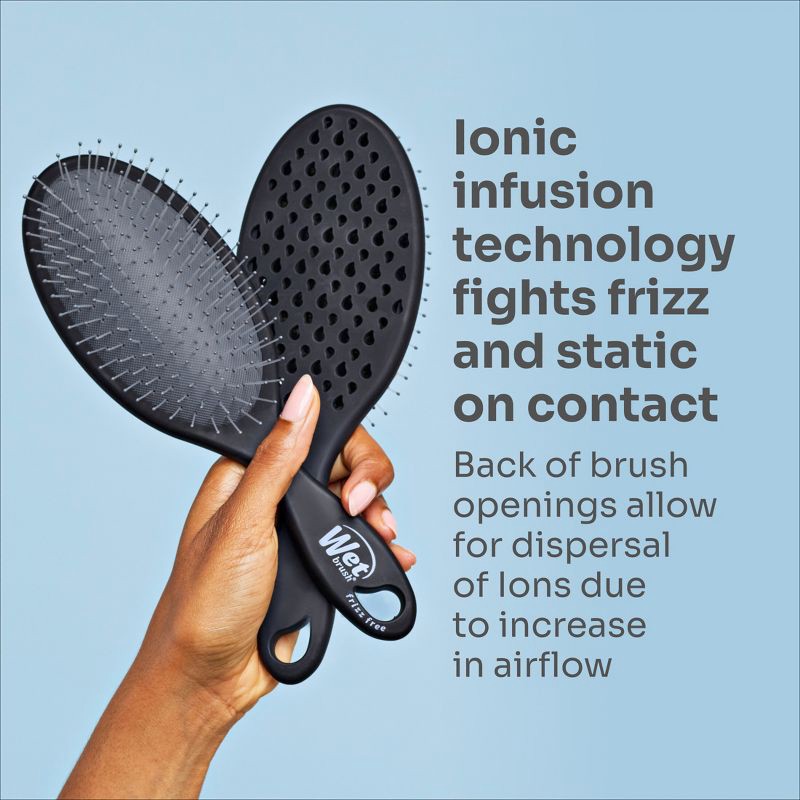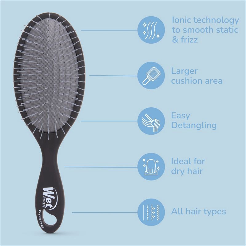 - Reduces Static for Less Frizz – Ionic technology in the brush releases negative ions to assist in restoring balance back to strands that can reduce frizz, static or flyaways. The more you brush, the more ions are released to assist in a smoother result.Smooth & Polished Hair - Say goodbye to static, hello to sleek locks! In every brush on dry hair negative ions fight frizz and static leaving hair looking smoother and more polished. A must-have beauty styling tool to manage your hair despite the weather.Designed For Shine – our patent-pending innovation within the brush incorporates ionic technology to help control frizz and enhance hair shine. Achieve a smoother and more polished finish with minimal effort. Minimizing static to leave hair sleek and healthy looking.Perfect for all hair types & Everyday Styling - Designed to combat frizz and static, the Frizz-Free Brush integrates technology to tackle weather-related and environmental hair challenges. Use this brush to control frizz, detangle or to prep your hair for elevated styles.Trusted Wet Brush Quality & Innovation – From the #1 detangling brand, Wet Brush combines advanced technology with proven design to deliver professional results, effortless styling, and healthier, happier hair - giving you confidence in every brush and every style.