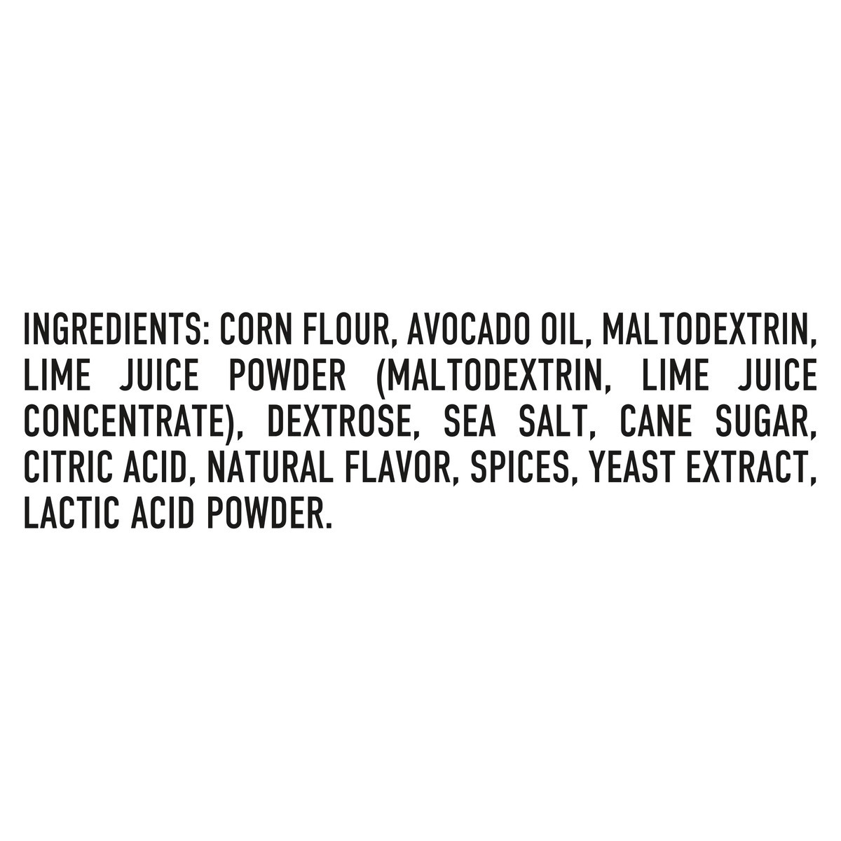 Corn Flour, Avocado Oil, Maltodextrin, Lime Juice Powder (Maltodextrin, Lime Juice Concentrate), Dextrose, Sea Salt, Cane Sugar, Citric Acid, Natural Flavor, Spices, Yeast Extract, Lactic Acid Powder.