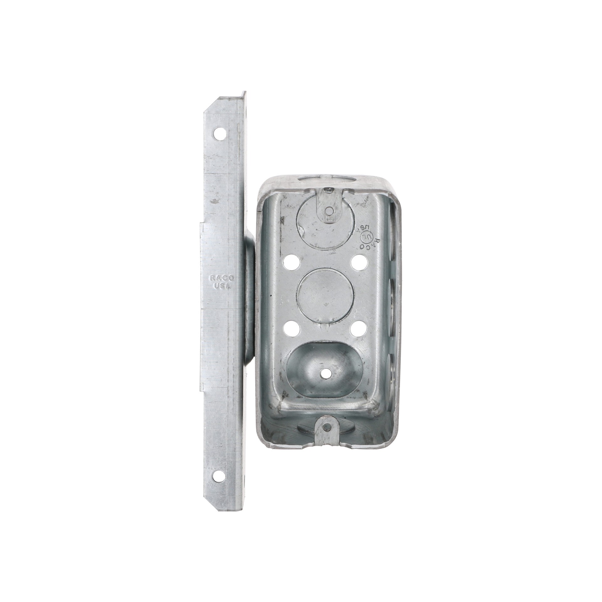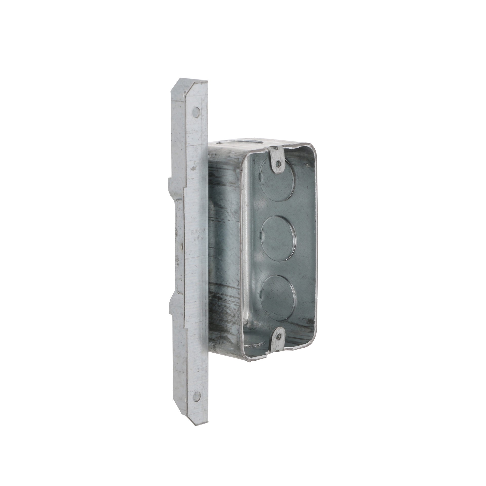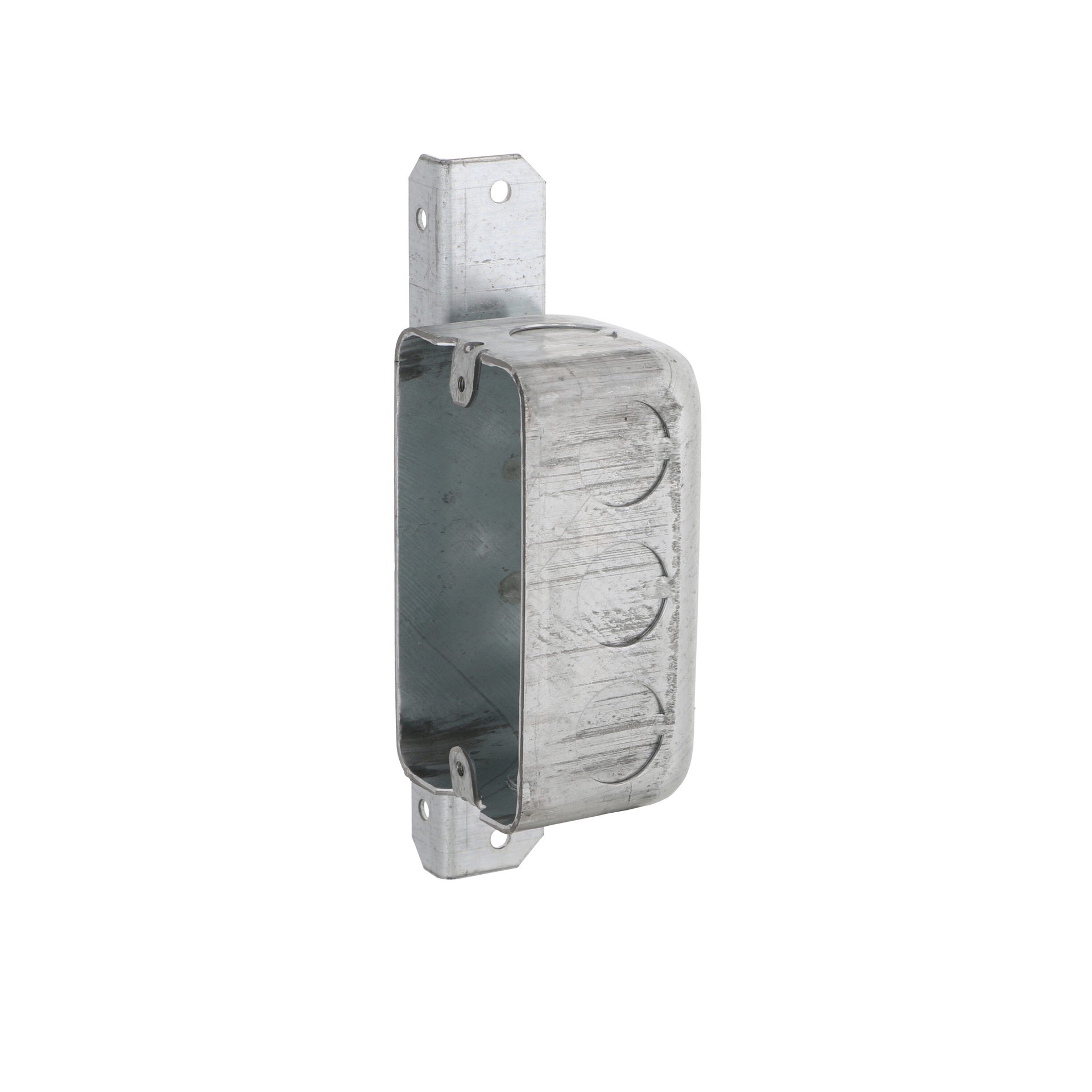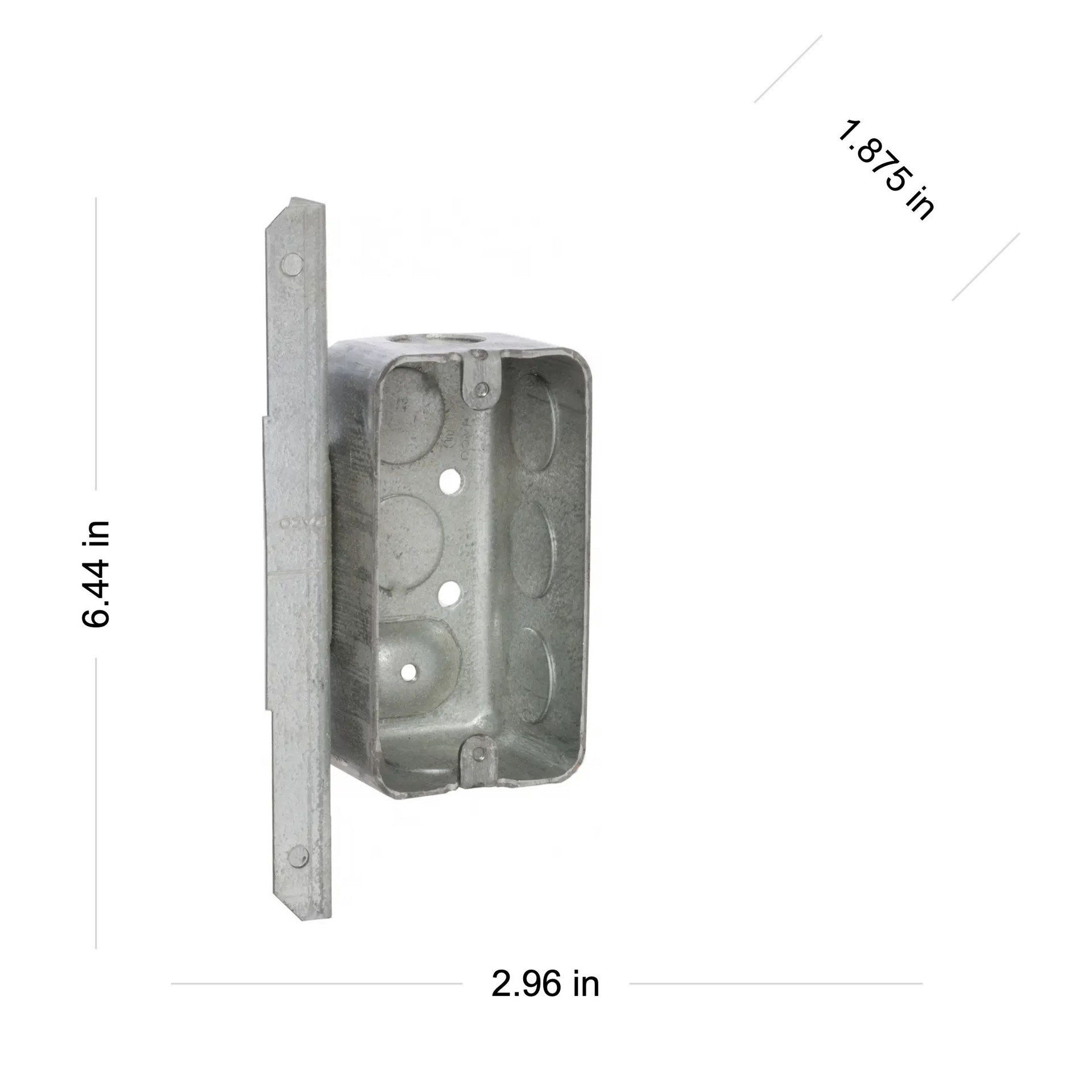 Eight 1/2 in knockouts. 1-7/8 in depth. Drawn construction. Raised ground. 13.0 cu in capacity. Positions box against face and side of metal or wood stud.