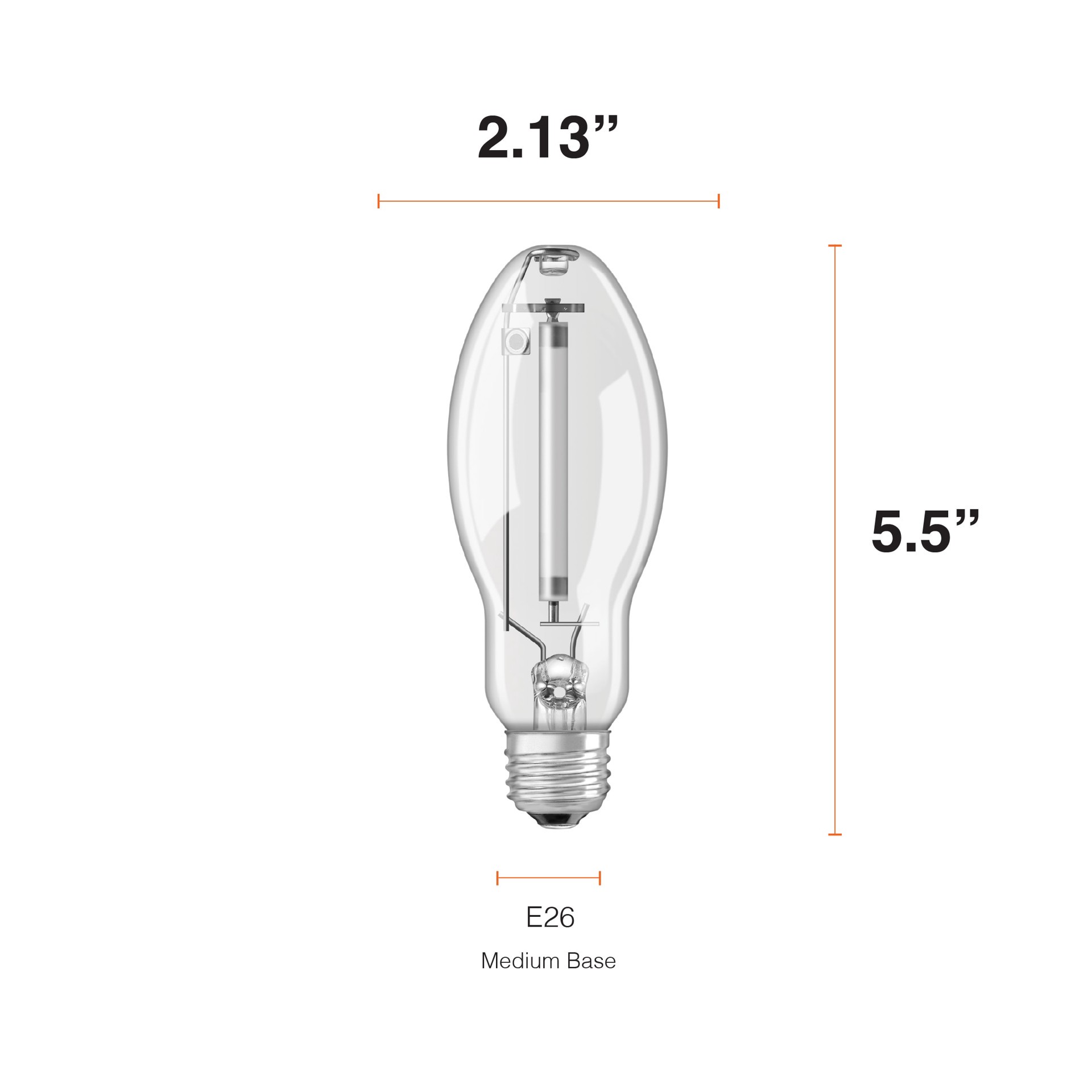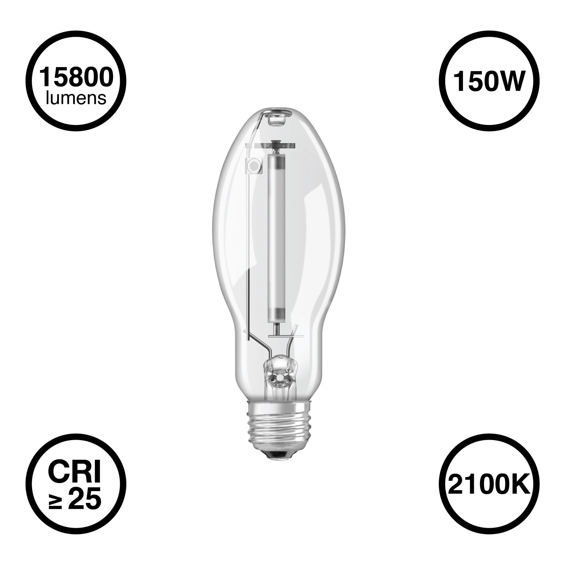 150-Watt high pressure sodium lamp delivers intense amber-toned light. ED17 bulb shape with medium E26 base fits standard HID fixtures. 2000K warm amber light ideal for security, street, and industria…