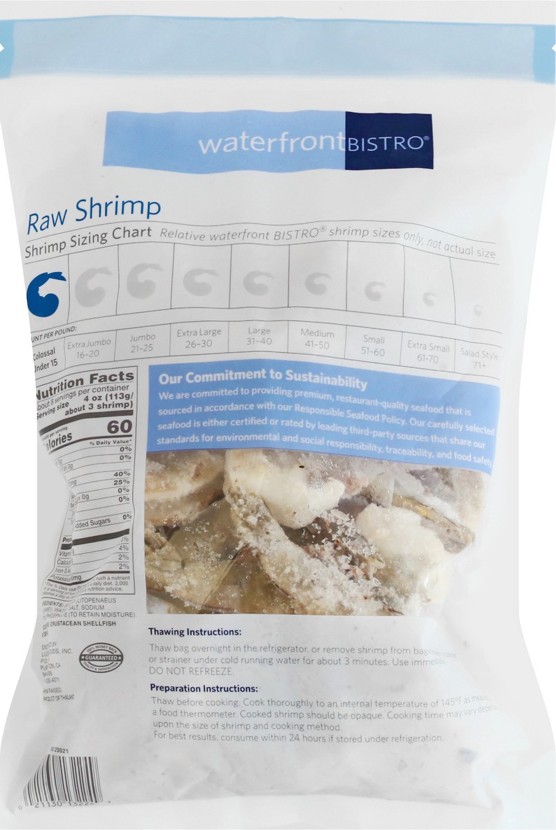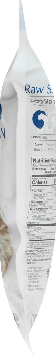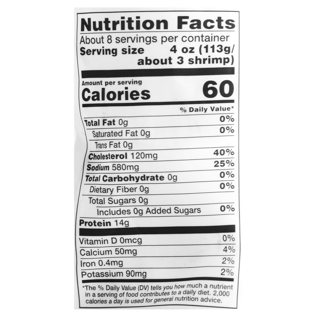Per 4 oz Serving: 60 calories; 0 g sat fat (0% DV); 580 mg sodium (25% DV); 0 g total sugars. Ez peel, shell & tail on. Colossal 8-12 count per lb. Responsible choice. 100% money back. Guaranteed qual…