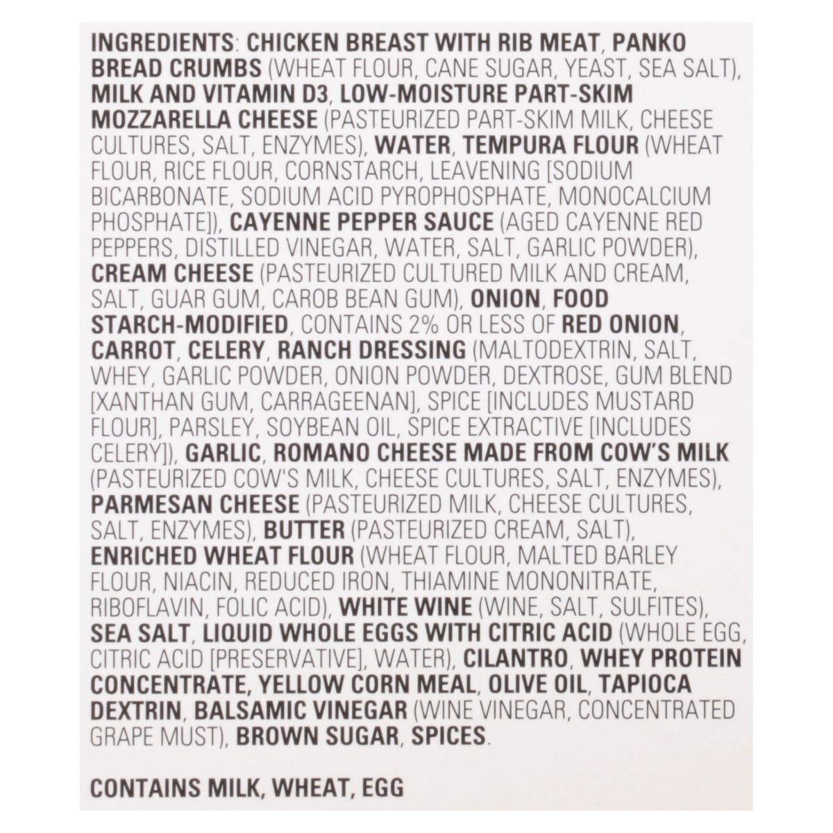 Chicken Breast with Rib Meat, Panko Bread Crumbs (Wheat Flour, Cane Sugar, Yeast, Sea Salt), Milk and Vitamin D3, Low-Moisture Part-Skim Mozzarella Cheese (Pasteurized Part-Skim Milk, Cheese Cultures,…
