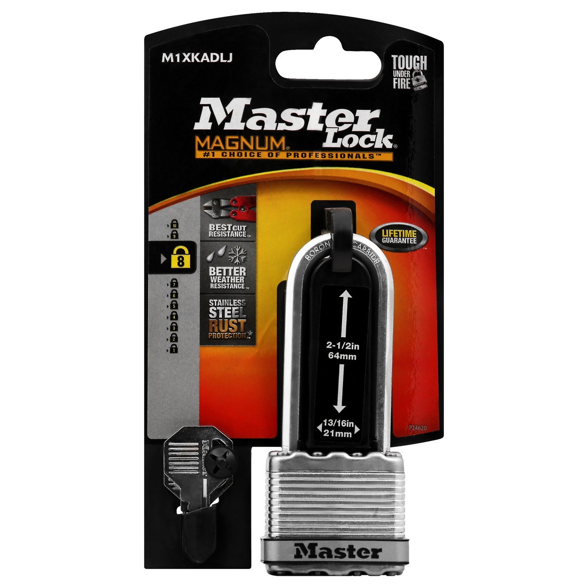 Tough under fire. No. 1 choice of professionals. Best cut resistance. Better weather resistance. Stainless steel rust protection. 2-1/in 64 mm. 13/16 in 21 mm. Octagonal Tough Cut shackle. Dual Armor …